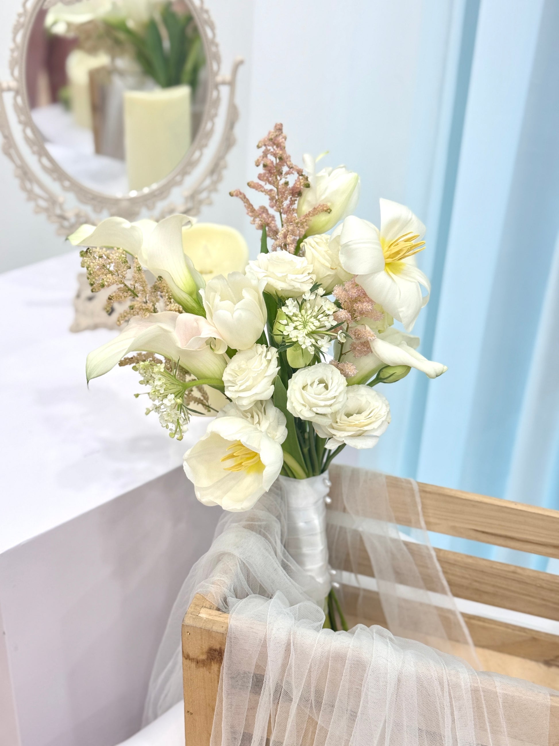 With a blend of pure whites and gentle greens, the Pure Bliss Bridal Bouquet embodies happiness and serenity. This bouquet is perfect for brides who want to radiate joy and peace on their wedding day.