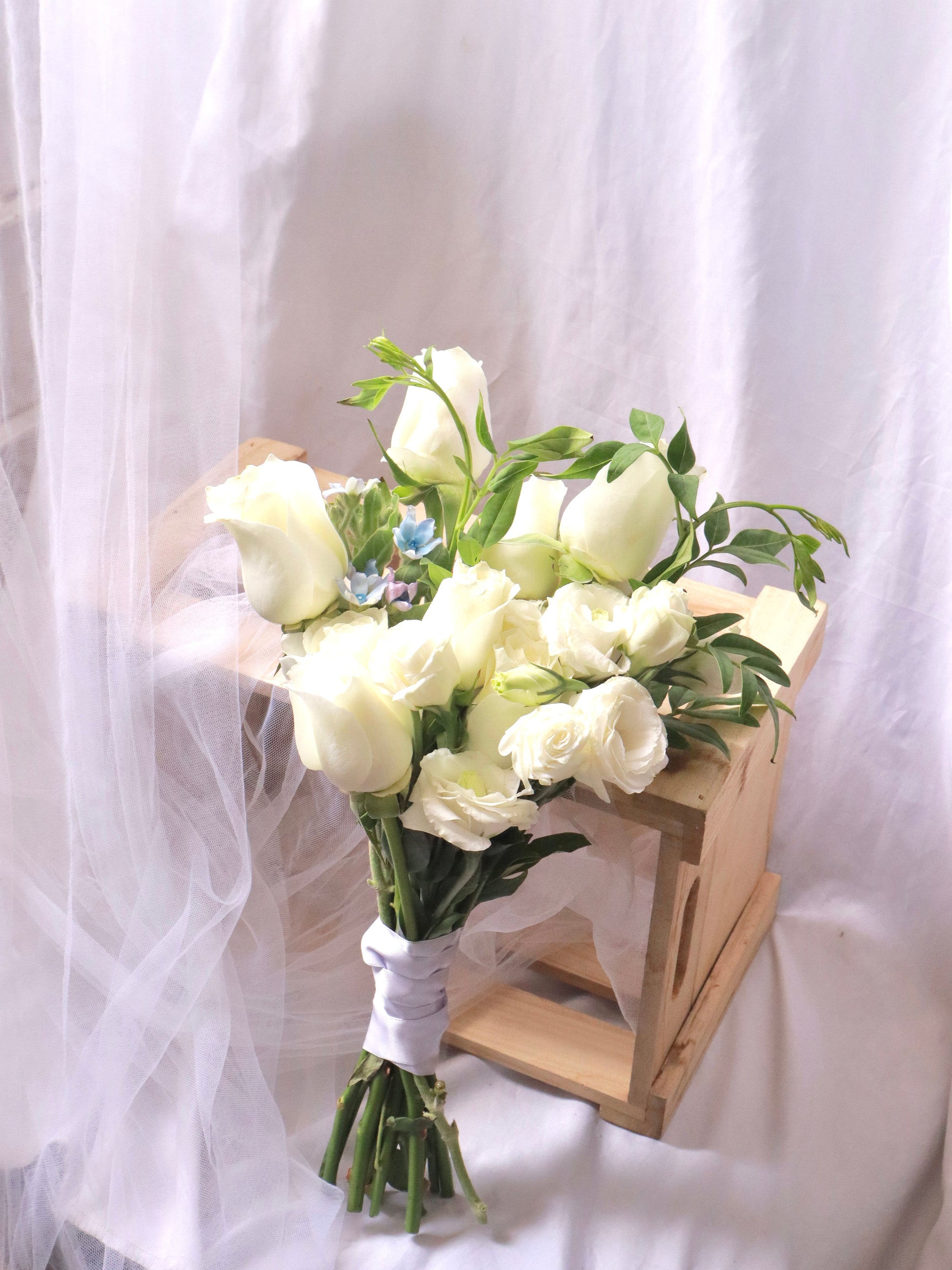 Our Pure Grace Bridal Bouquet exudes timeless elegance, featuring pristine white roses arranged to perfection. This exquisite bouquet symbolizes purity and love, making it the perfect accessory for your special day. Elevate your wedding with its classic, graceful charm.