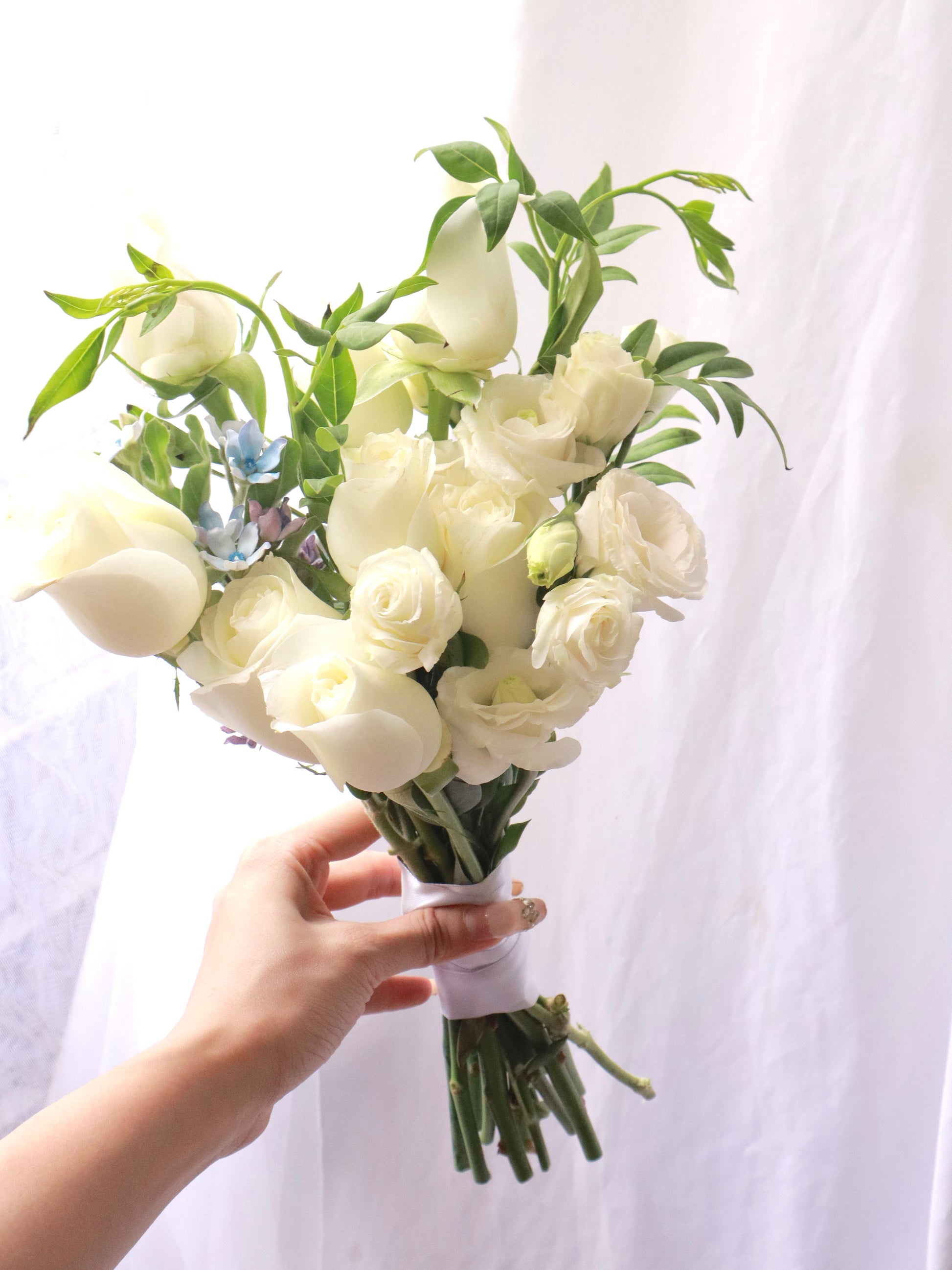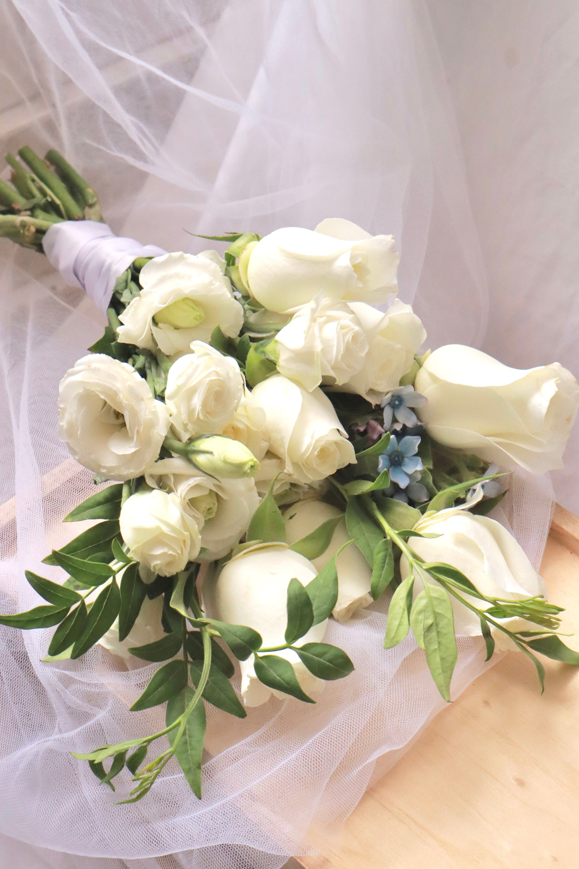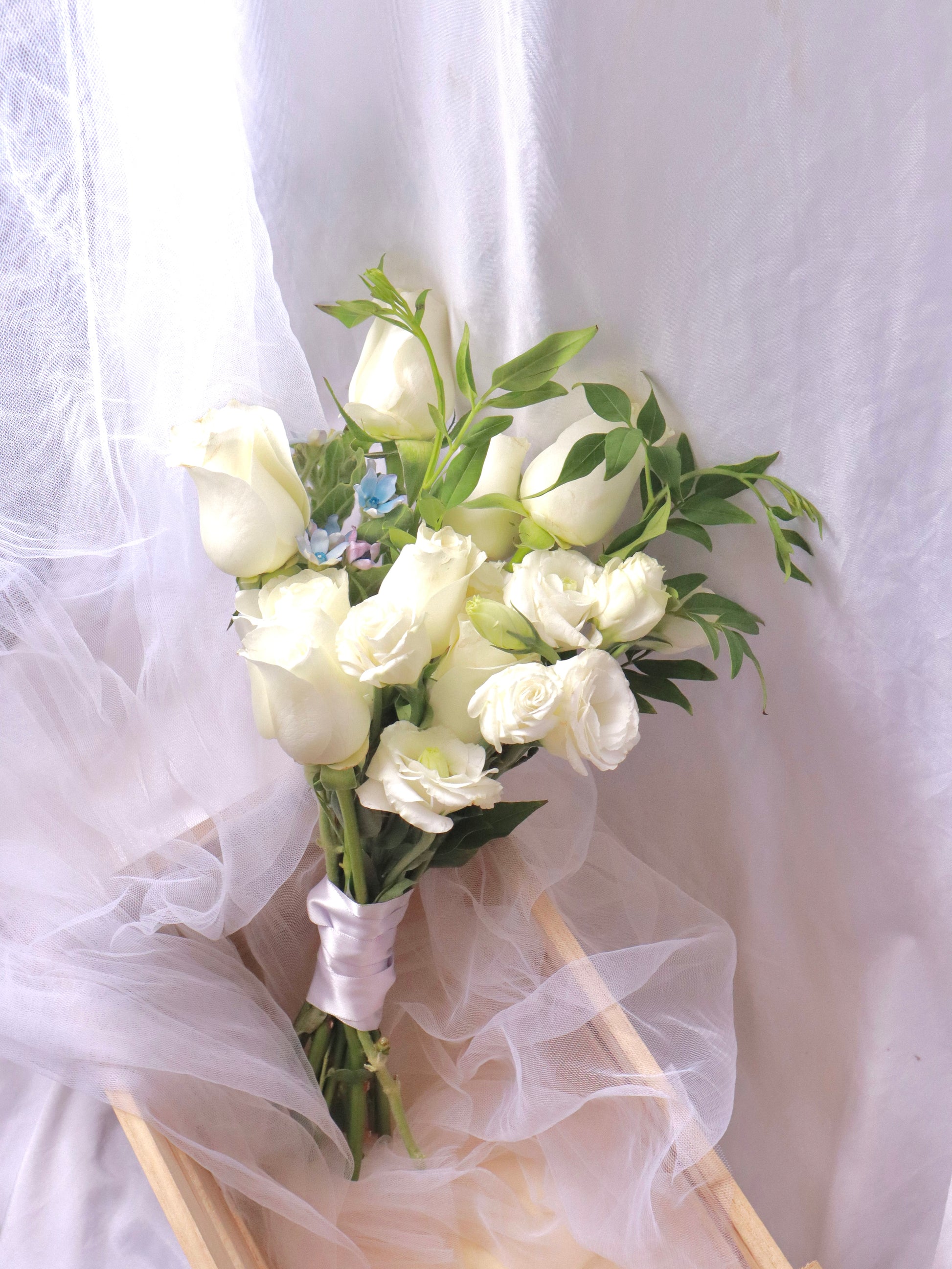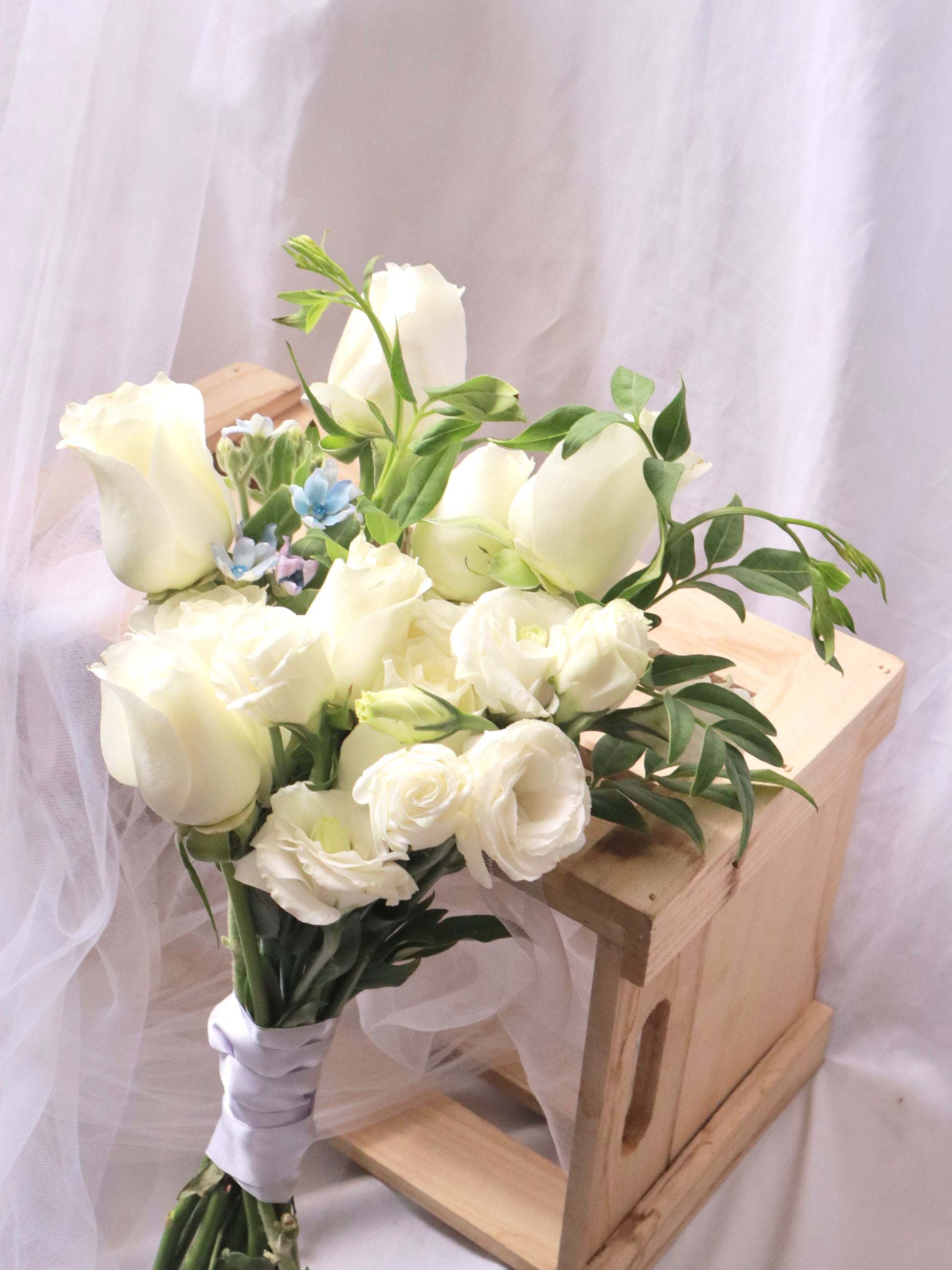 White Rose, White Eustoma, Mini Delphinium Blue, Leaves