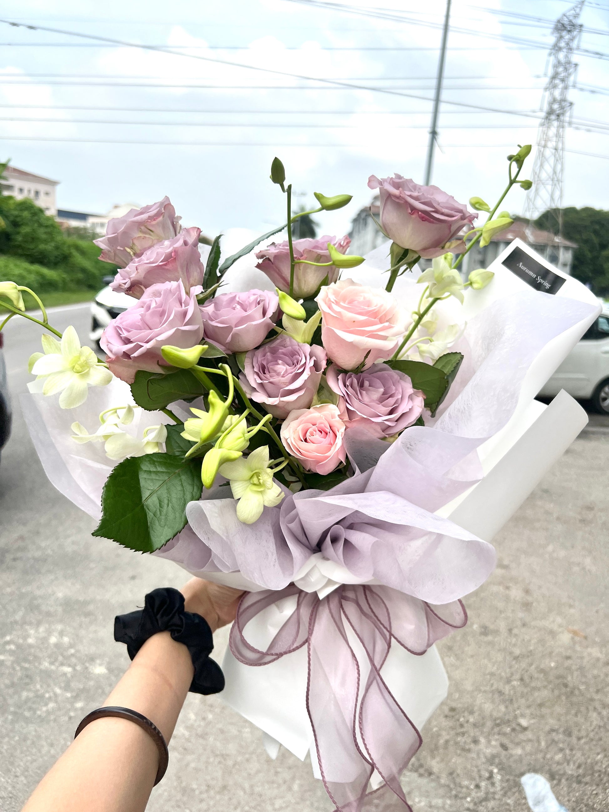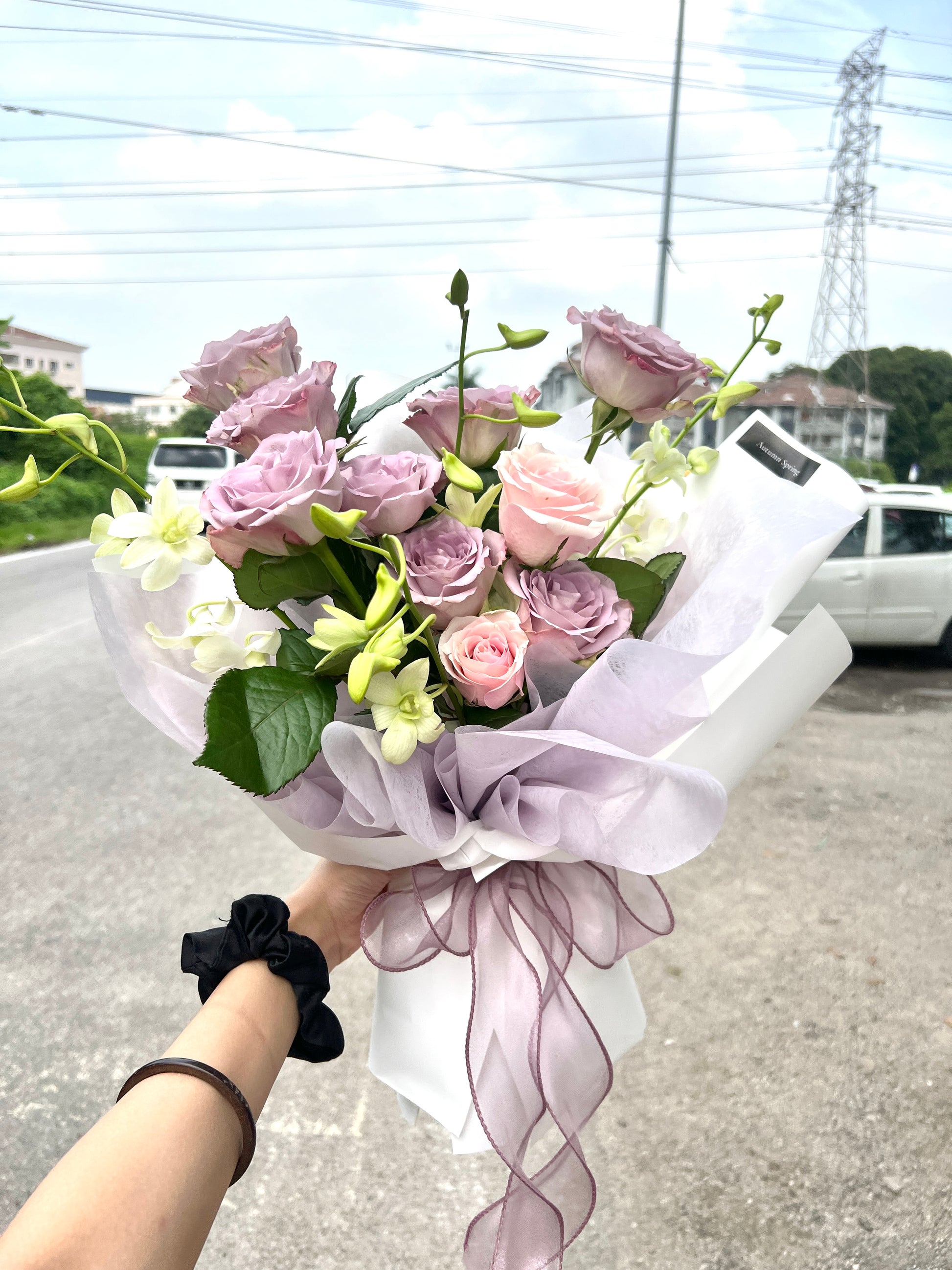 Experience the charm of the Purple Field Rose Bouquet. This enchanting arrangement combines soft pinks, rich purples, and delicate whites, creating a sophisticated and elegant display. Perfect for adding a touch of grace and beauty to any occasion.