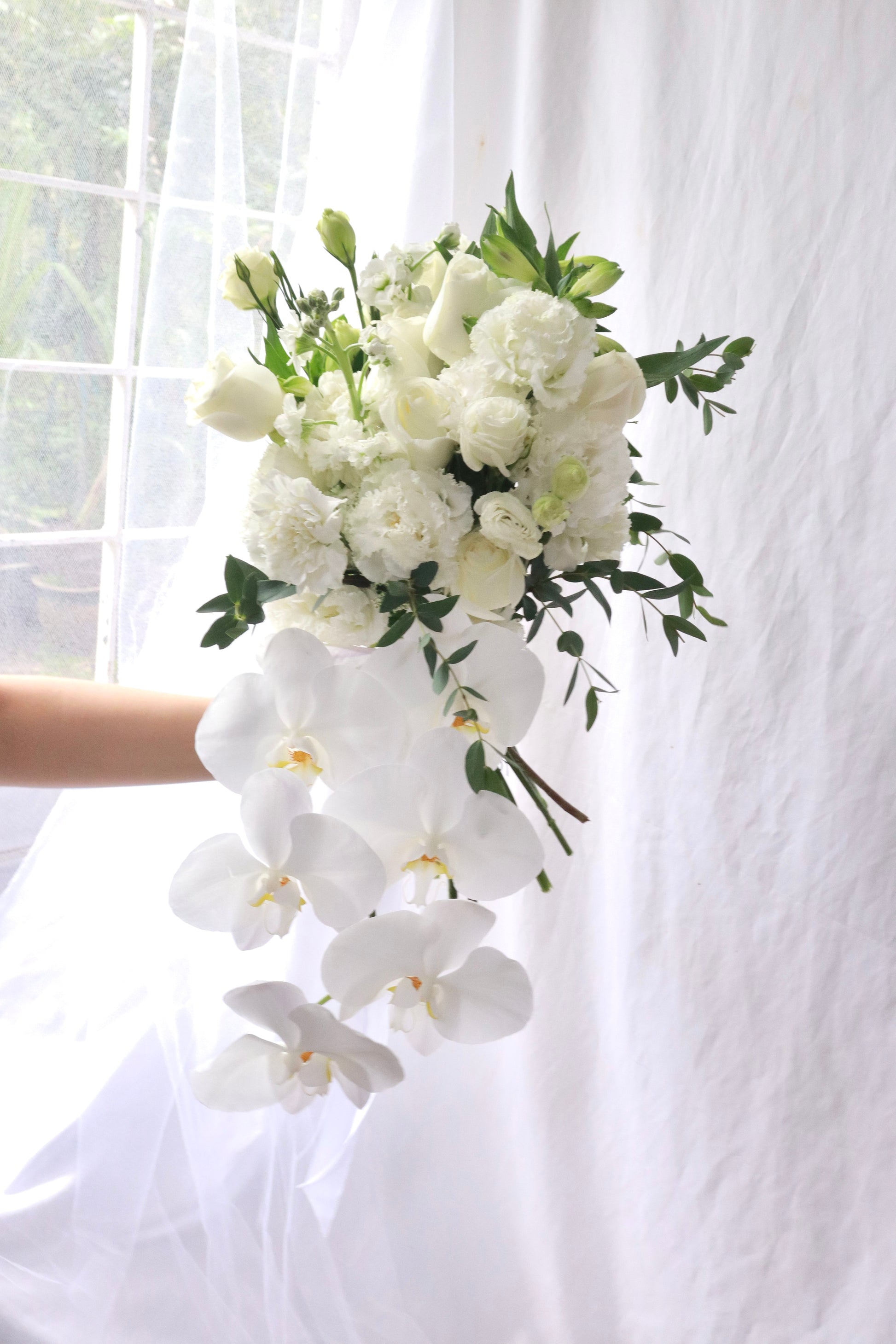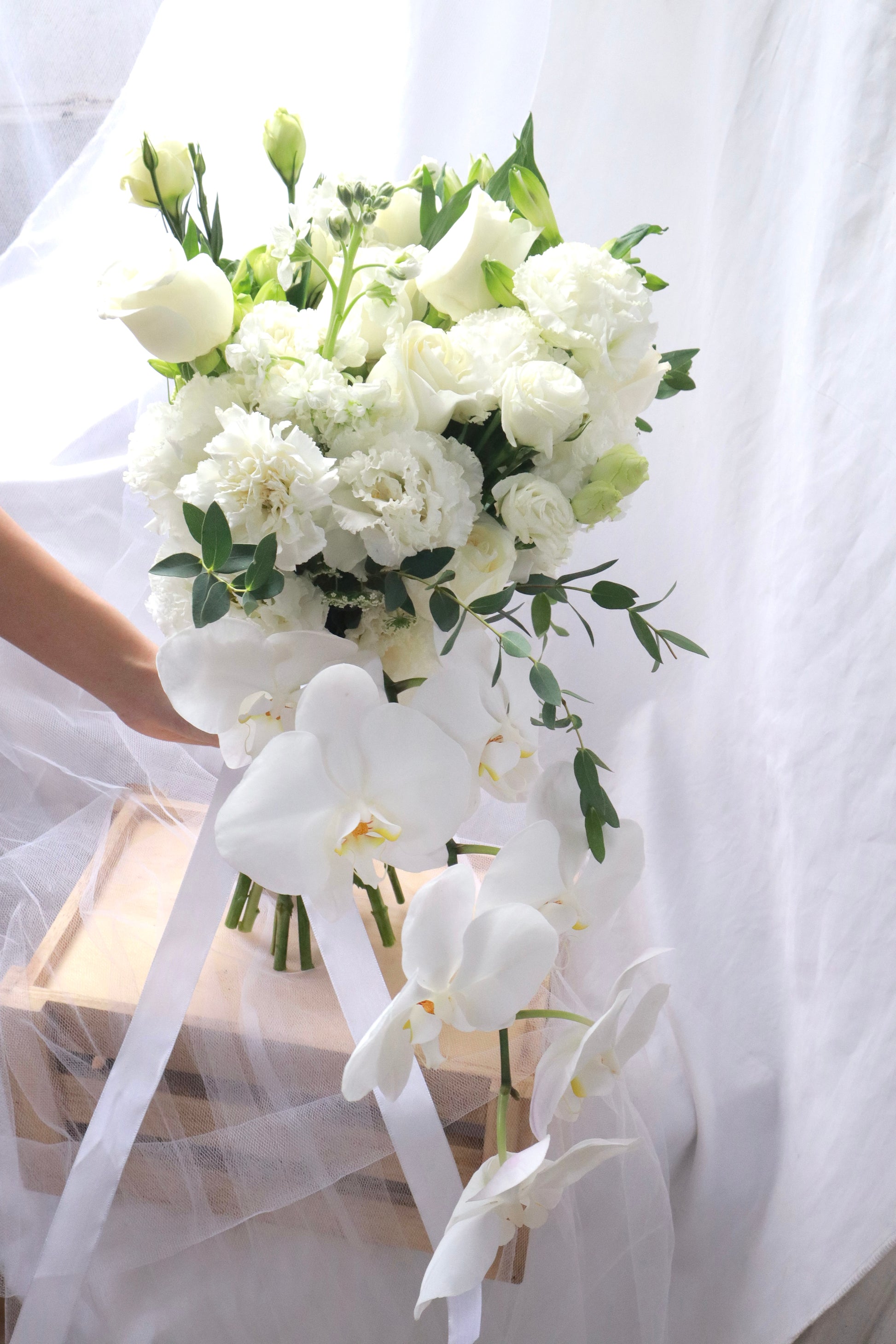 White Rose, White Eustoma. White Alstroemeria, White Matthiola, White Carnation, White Phalaenopsis Orchid