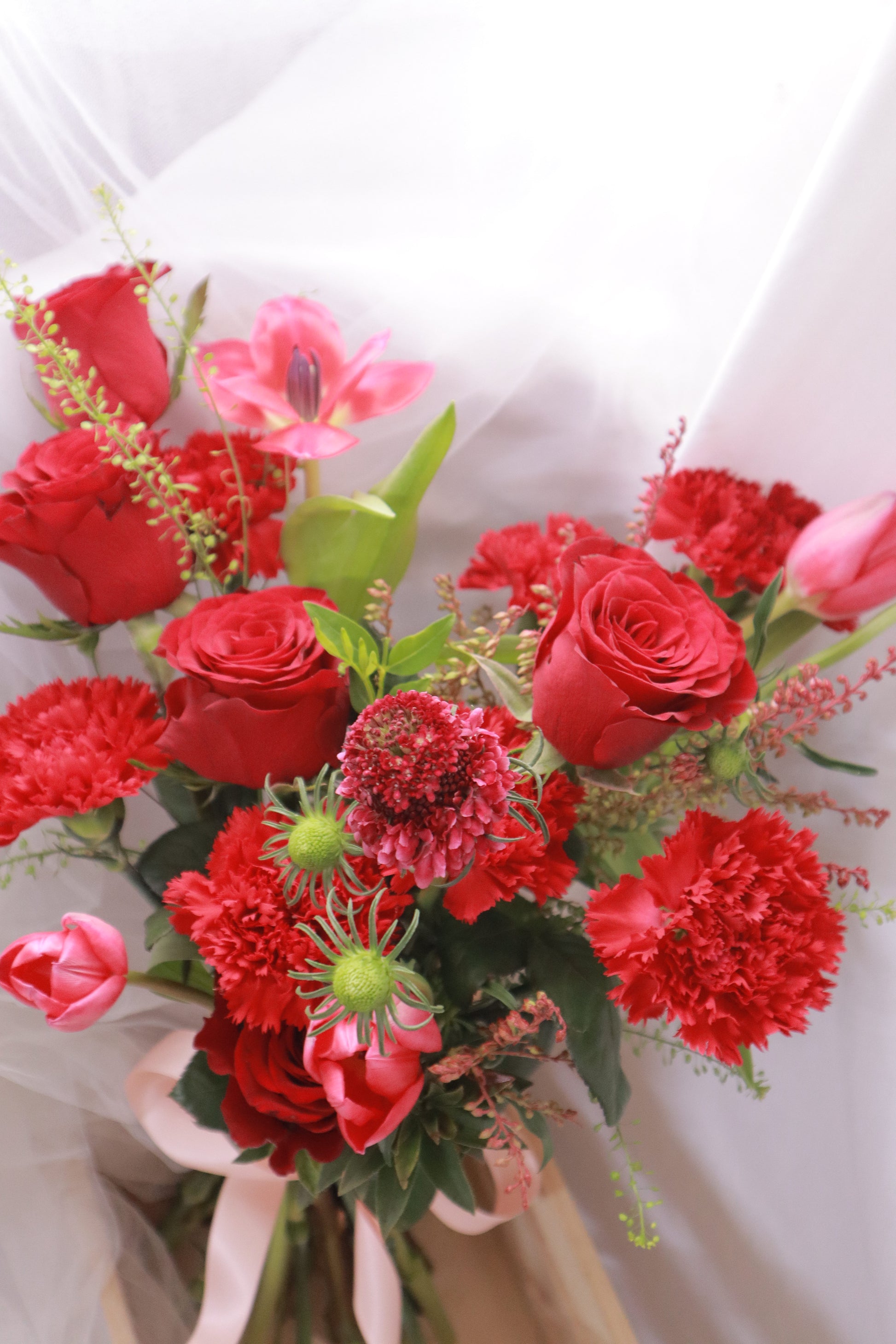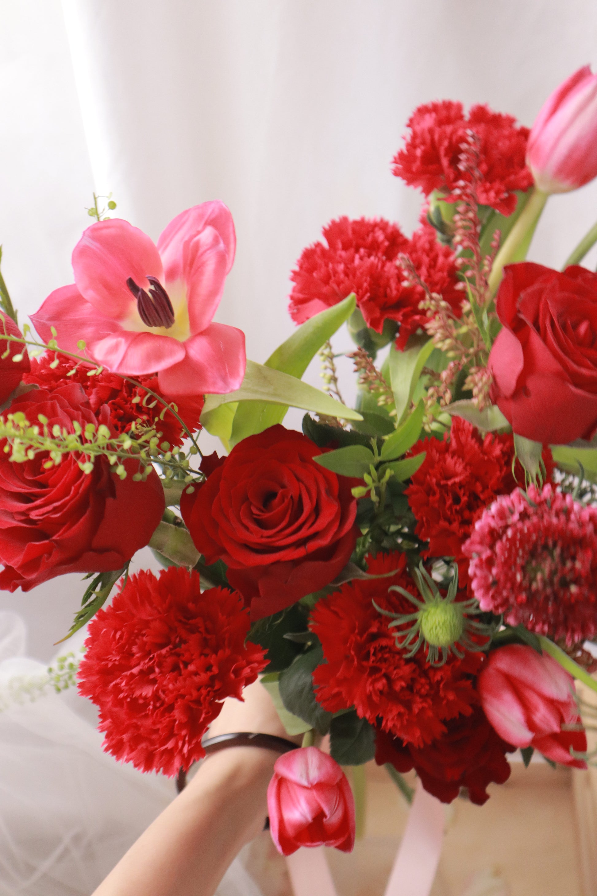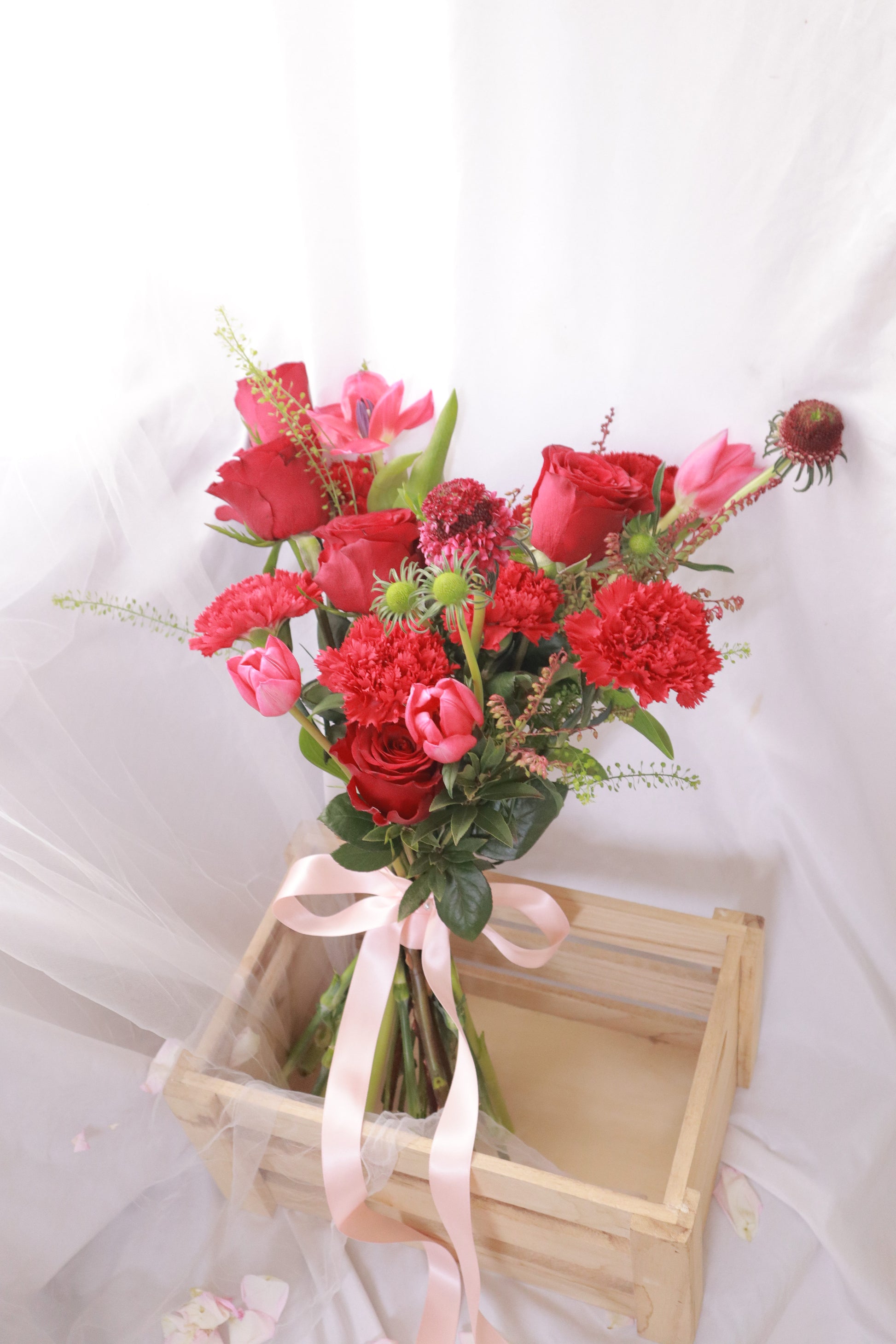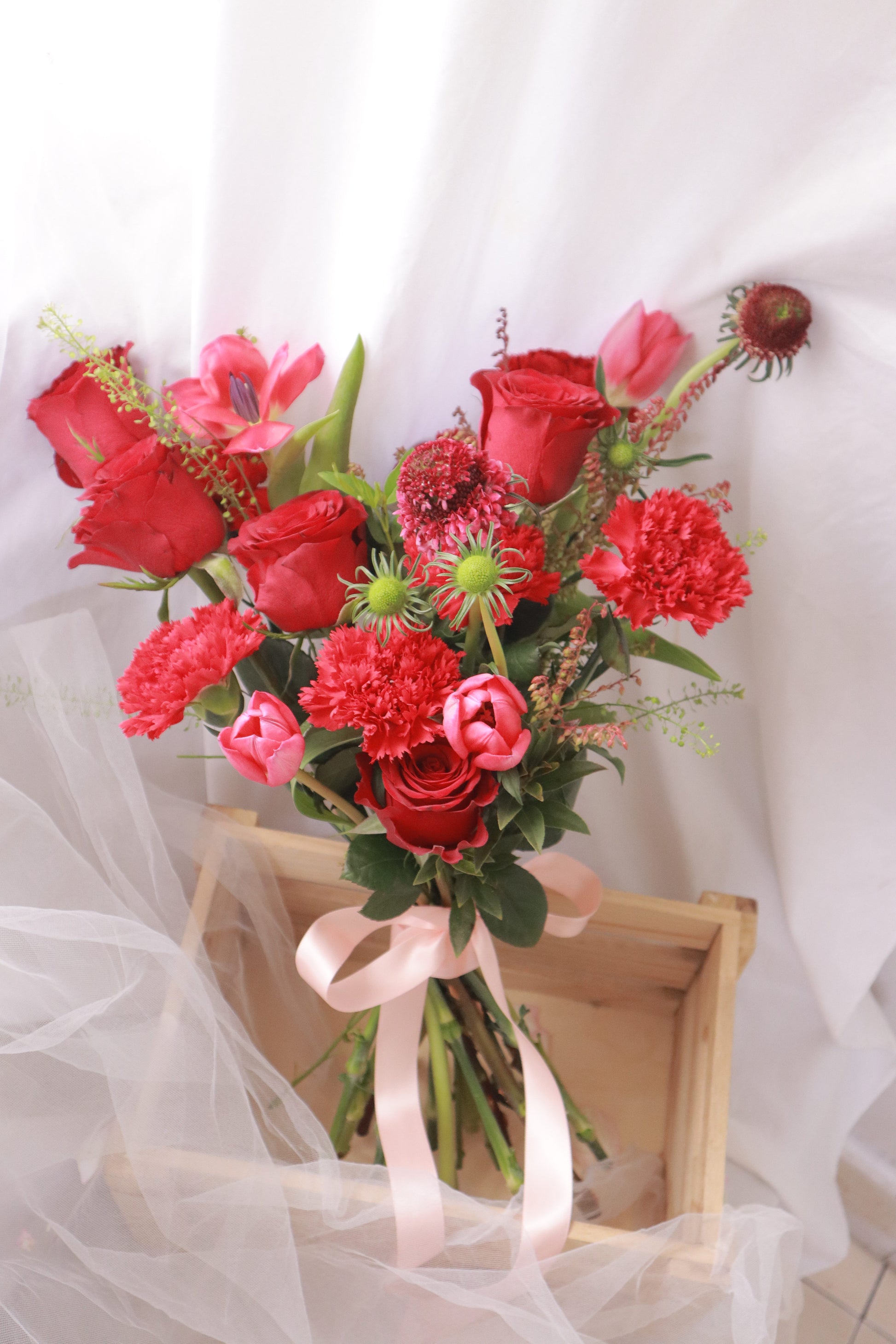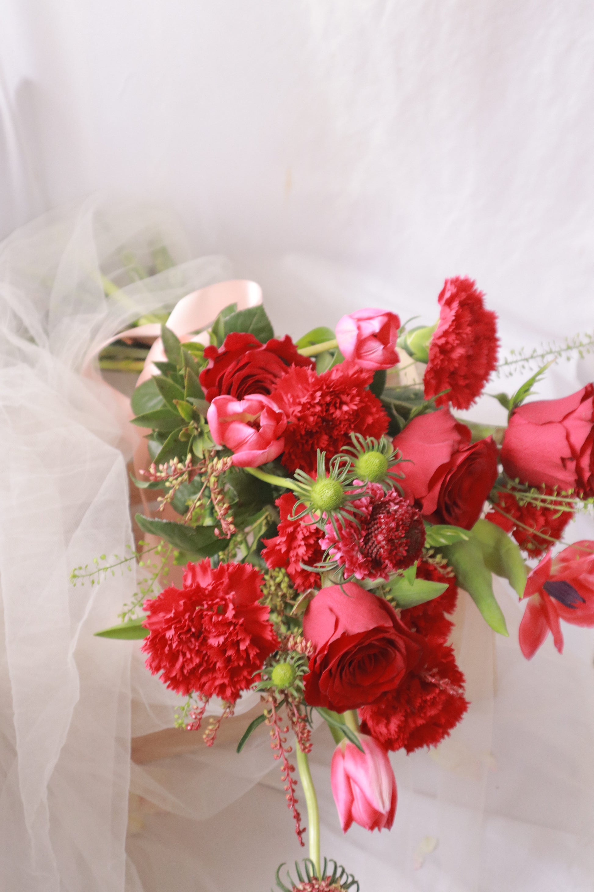 Red Rose, Red Tulip, Scabiosa, Red Carnation, Thlaspi Green Bell