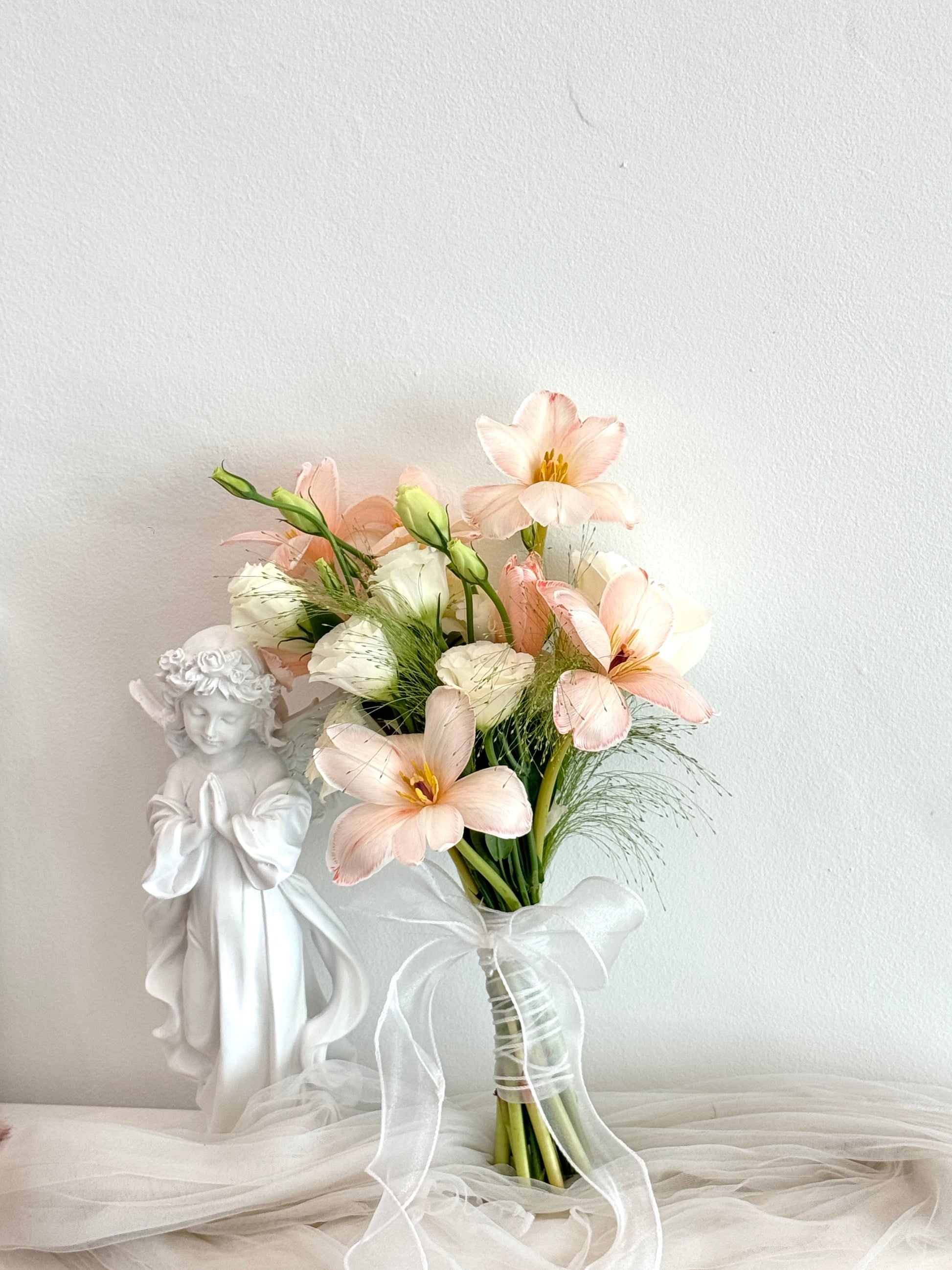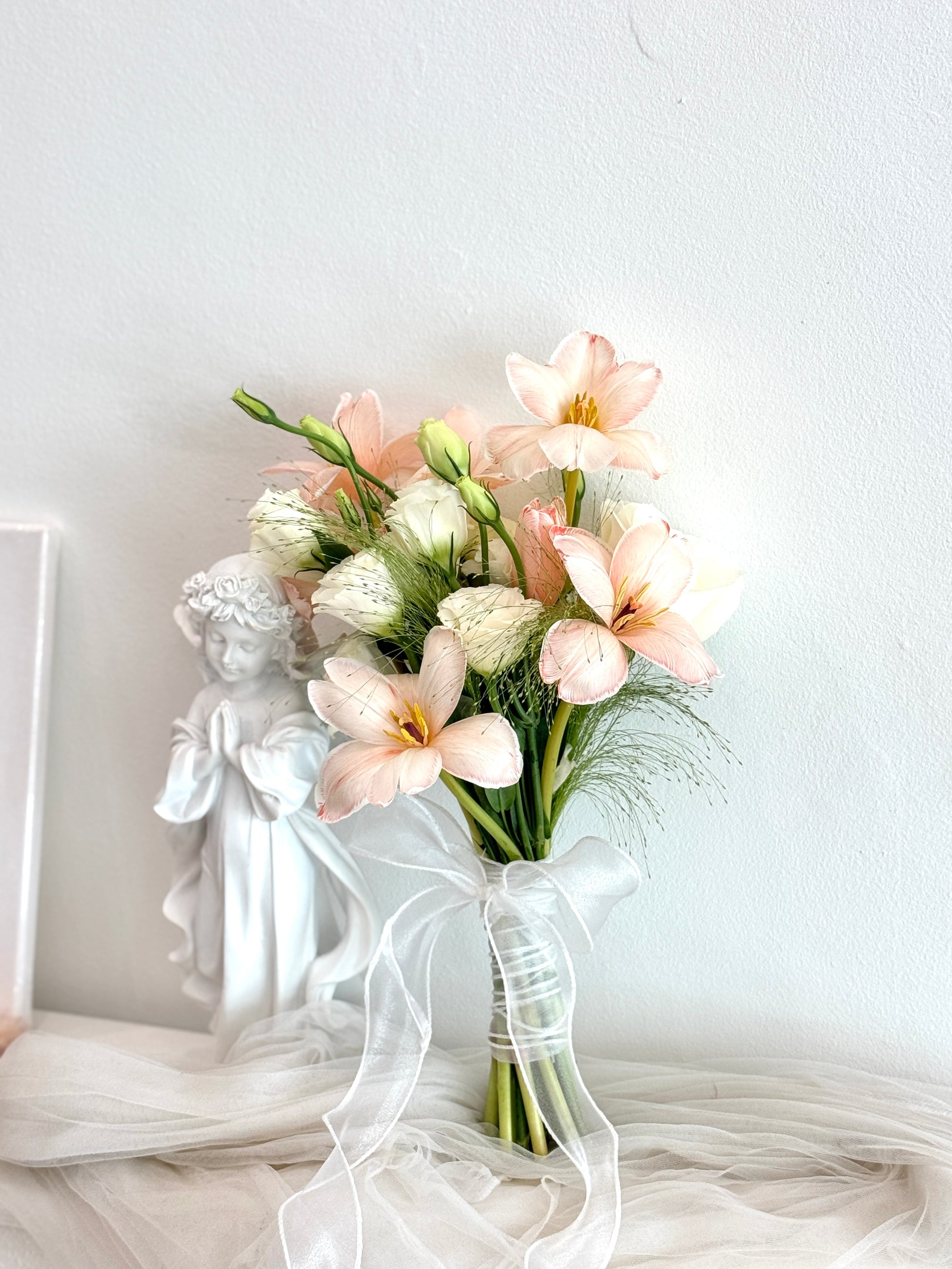 Full of soft, ethereal blooms, the Romantic Dream bouquet weaves together dreamy florals in shades of blush and ivory. This bouquet evokes the magic and tenderness of a fairy-tale romance, perfect for a bride with a whimsical heart.