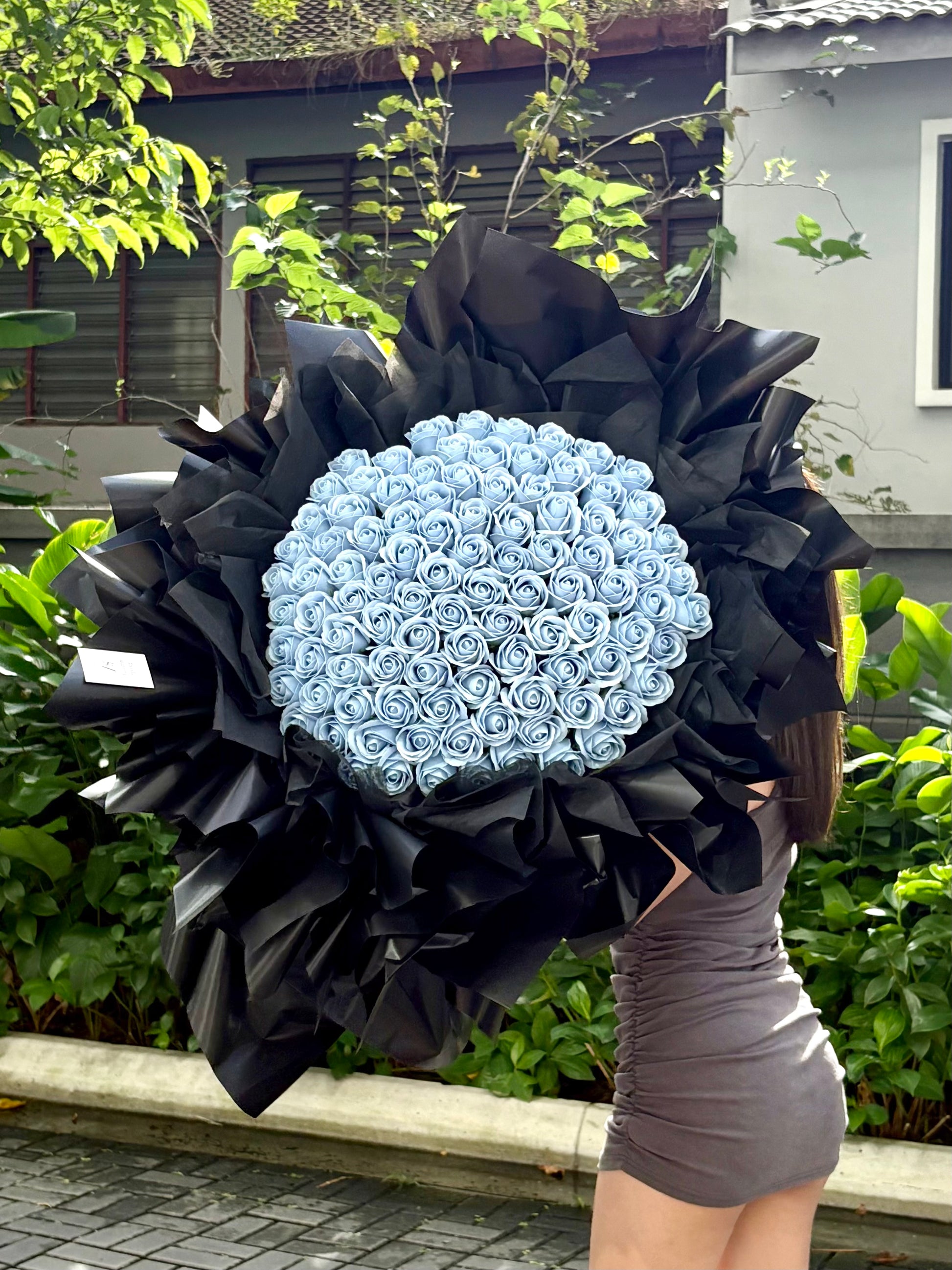 A breathtaking bouquet of blue-black soap roses, symbolizing mystery, depth, and the beauty of the unknown. These elegant blooms evoke the calm and quiet of a starlit night, with their deep, dark petals bringing a sense of sophistication and timeless allure. Wrapped with care, this bouquet makes a bold yet graceful statement for any occasion.