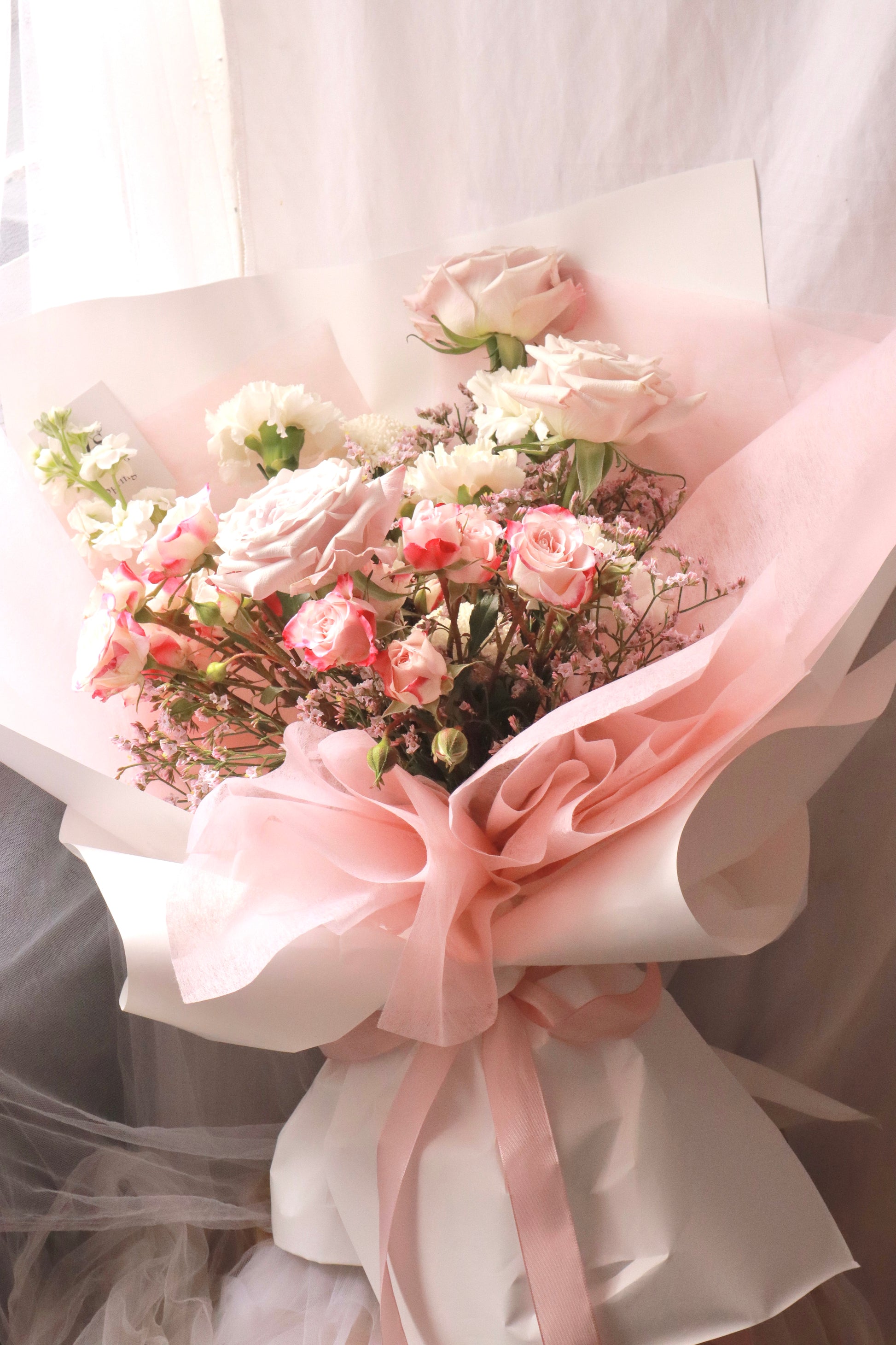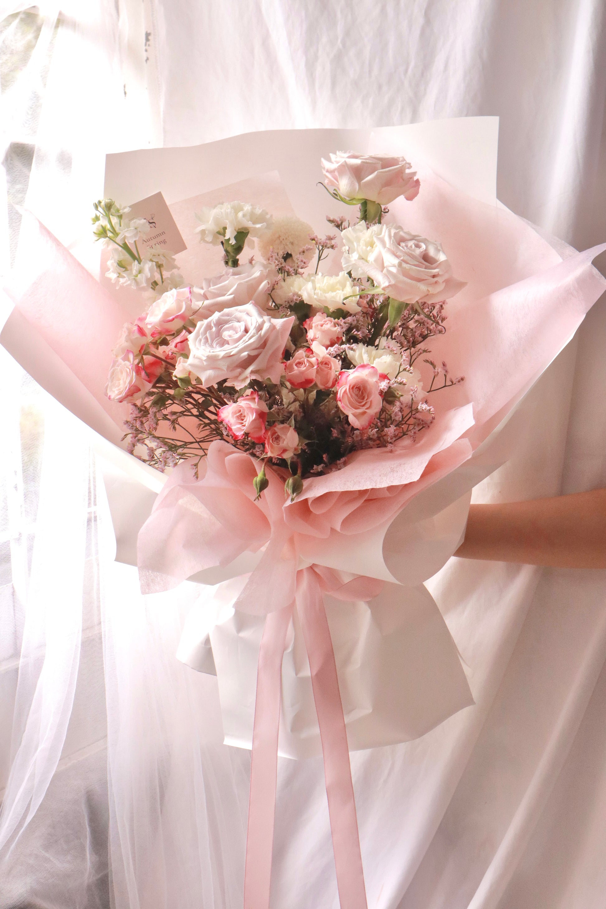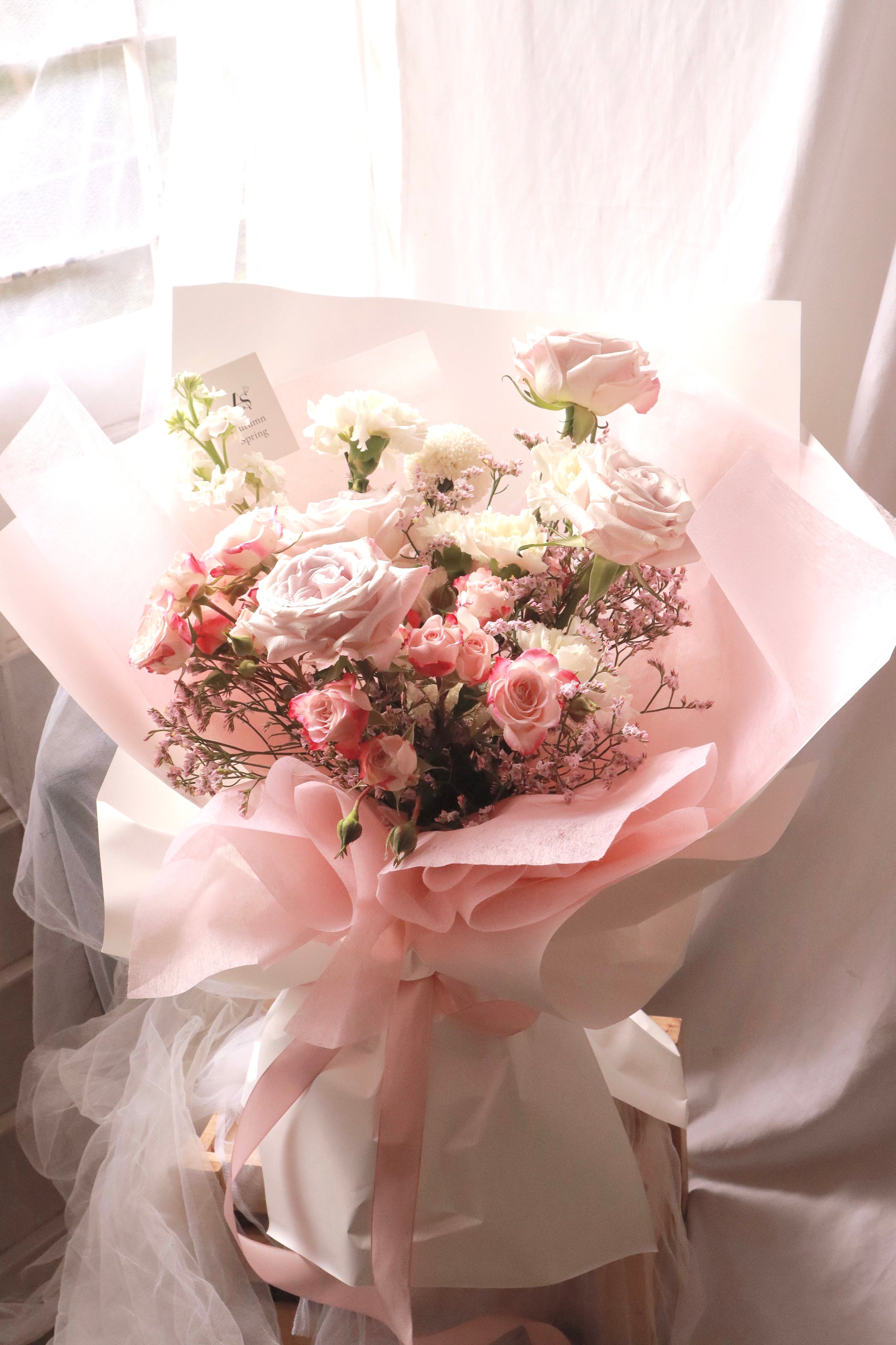 Our Rosy Serenity Bouquet beautifully combines manta roses, white carnations, white ping pong flowers, Rose Spray Reflex and white matthiola and fillers. This elegant arrangement radiates peace and romance, perfect for any special occasion.