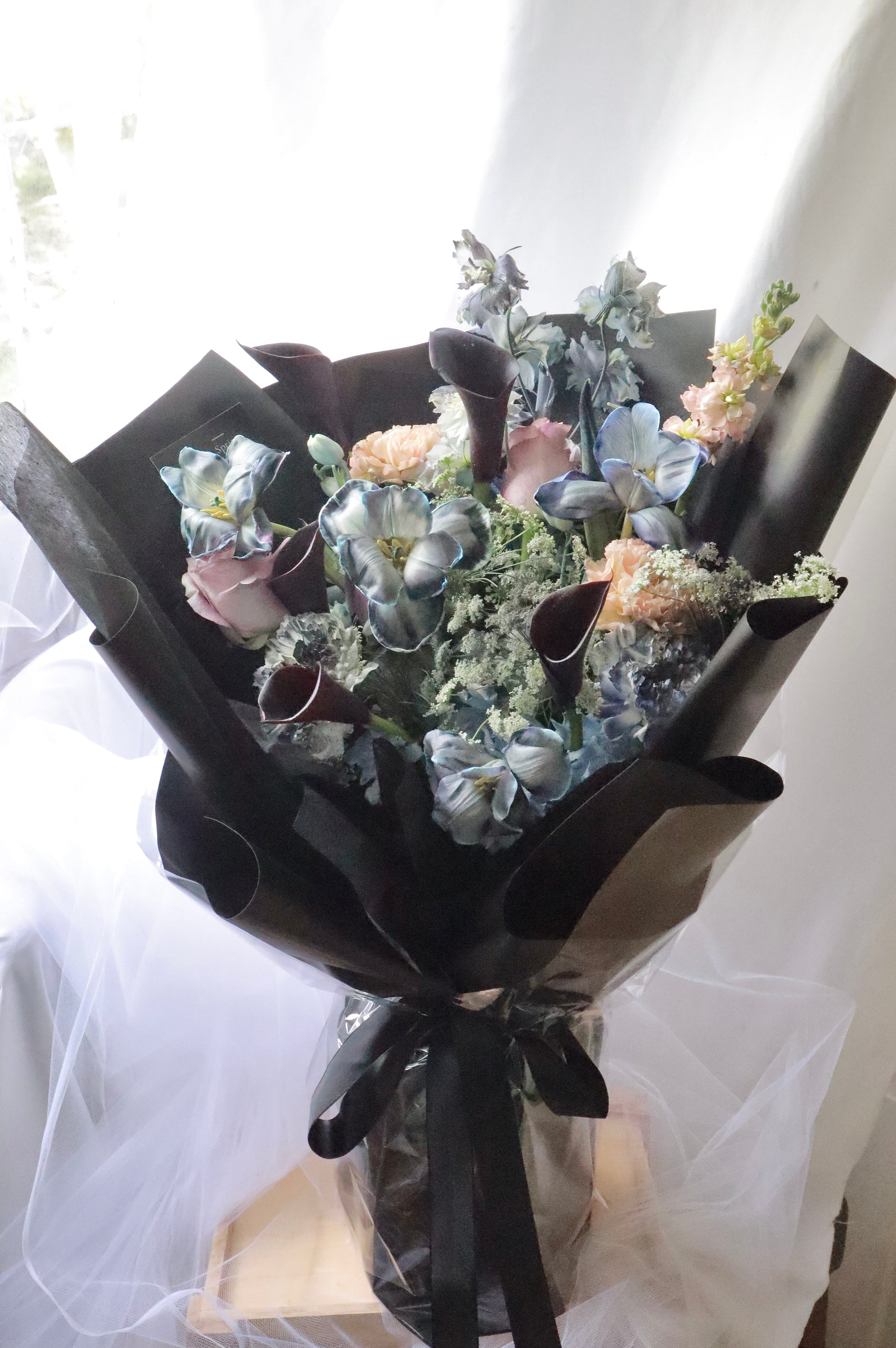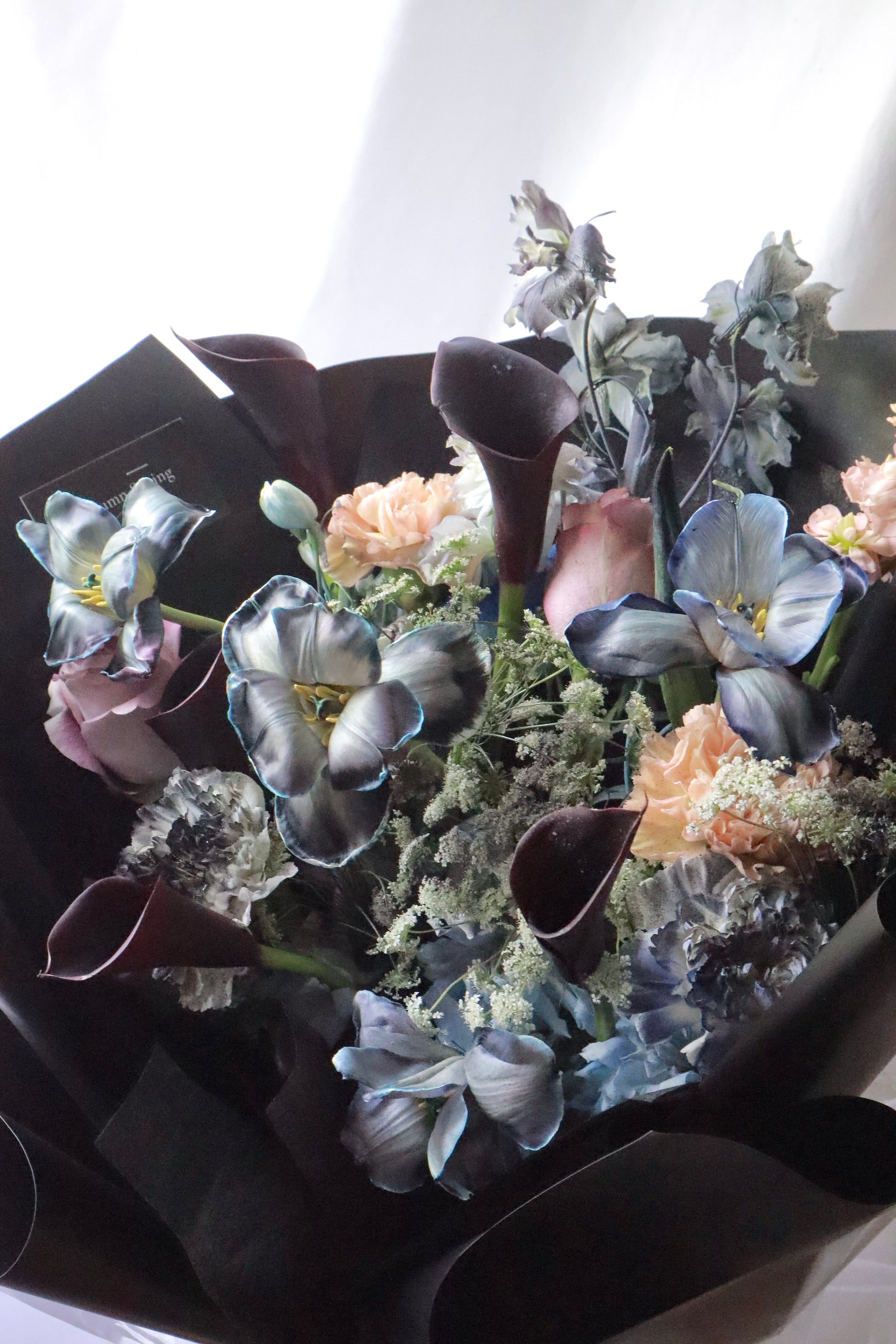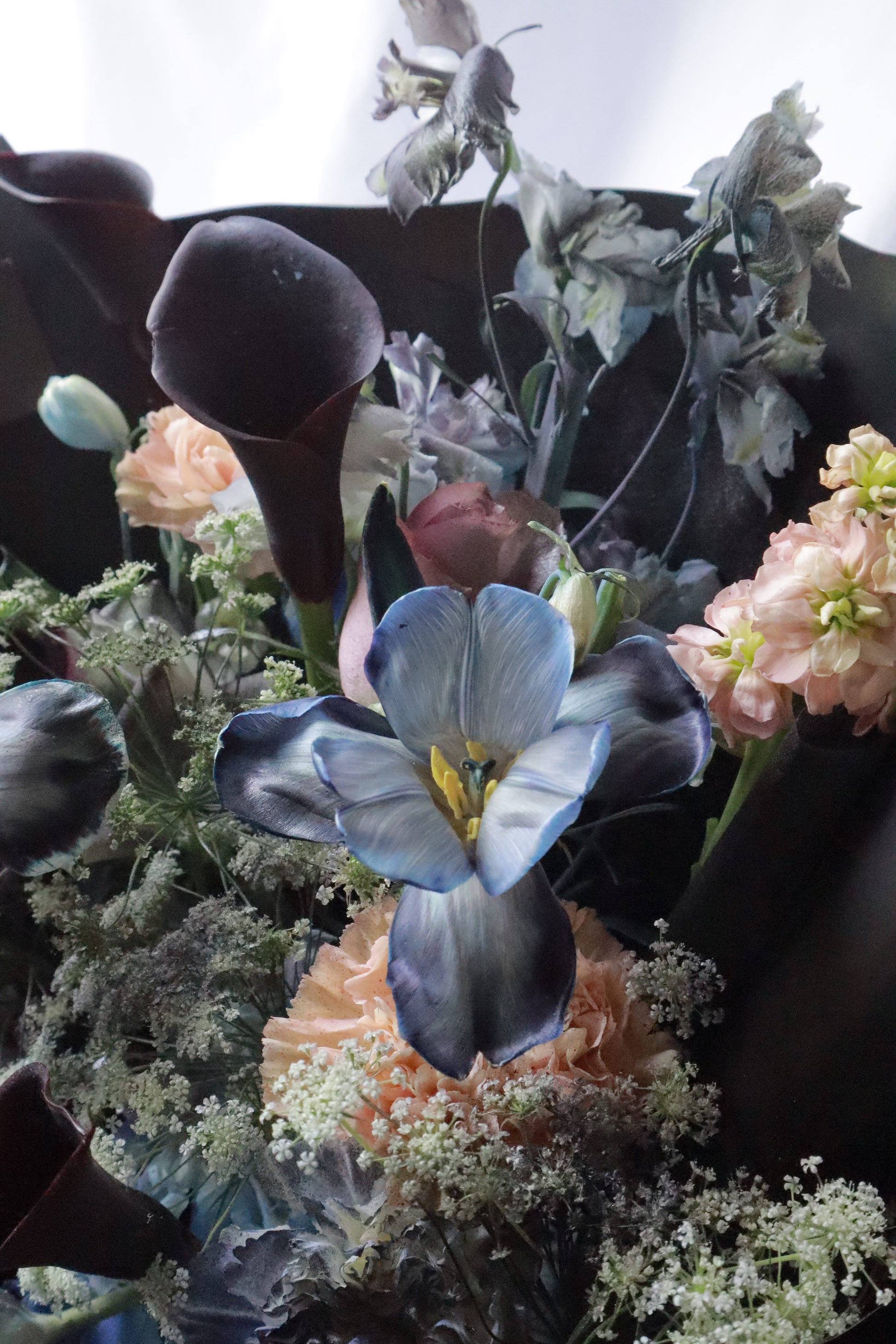 calla lily, dyed tulips, matthiola, fillers, roses.