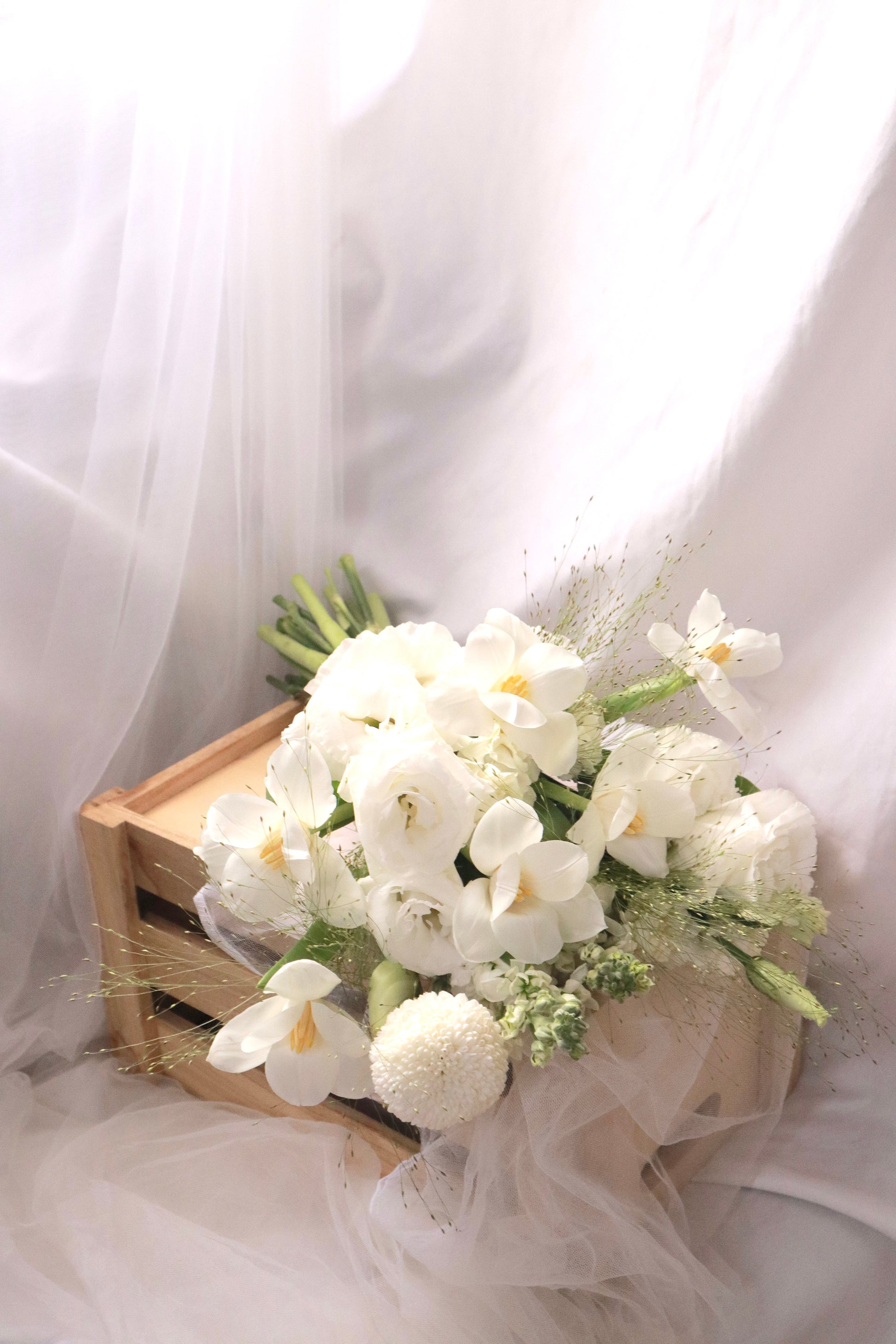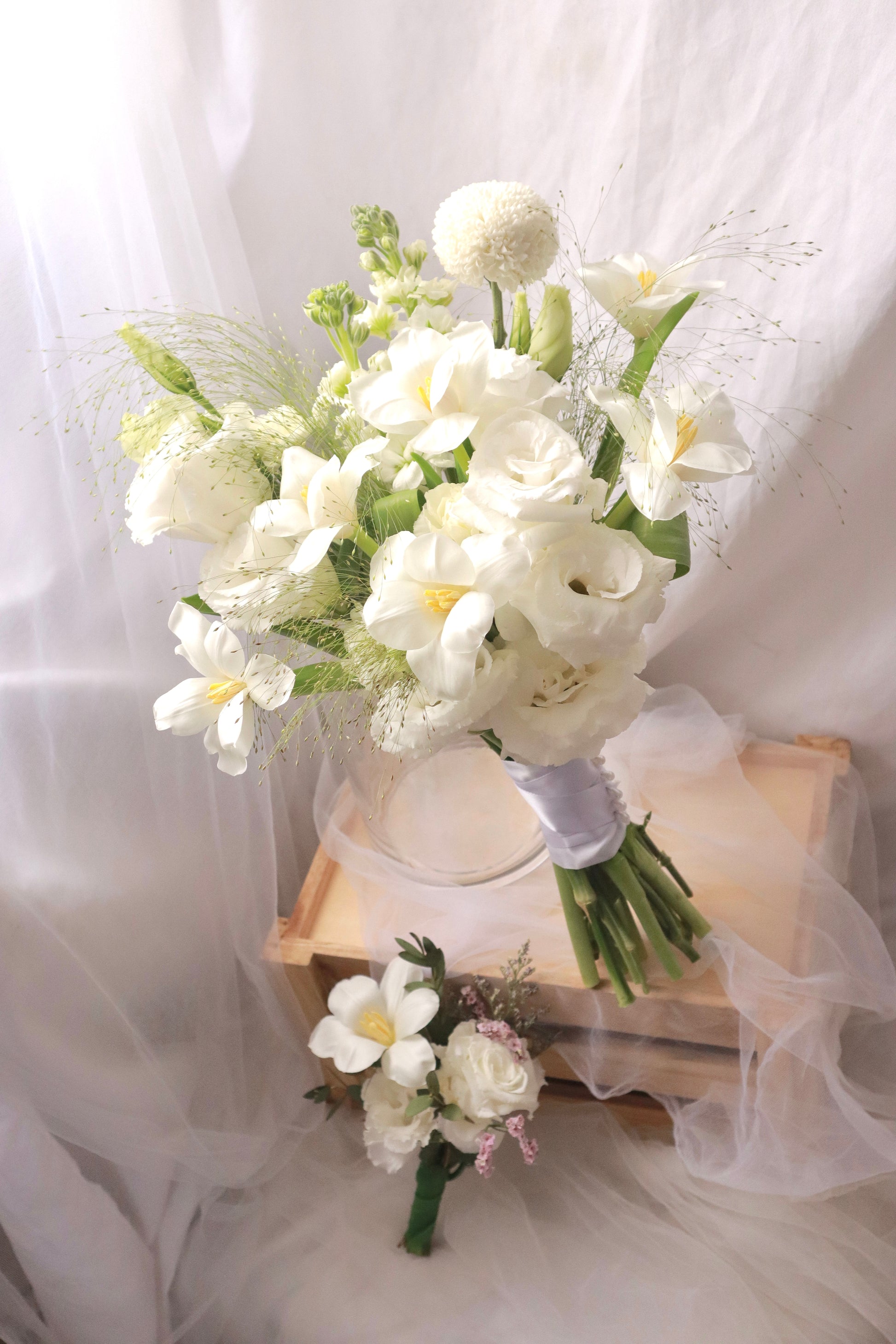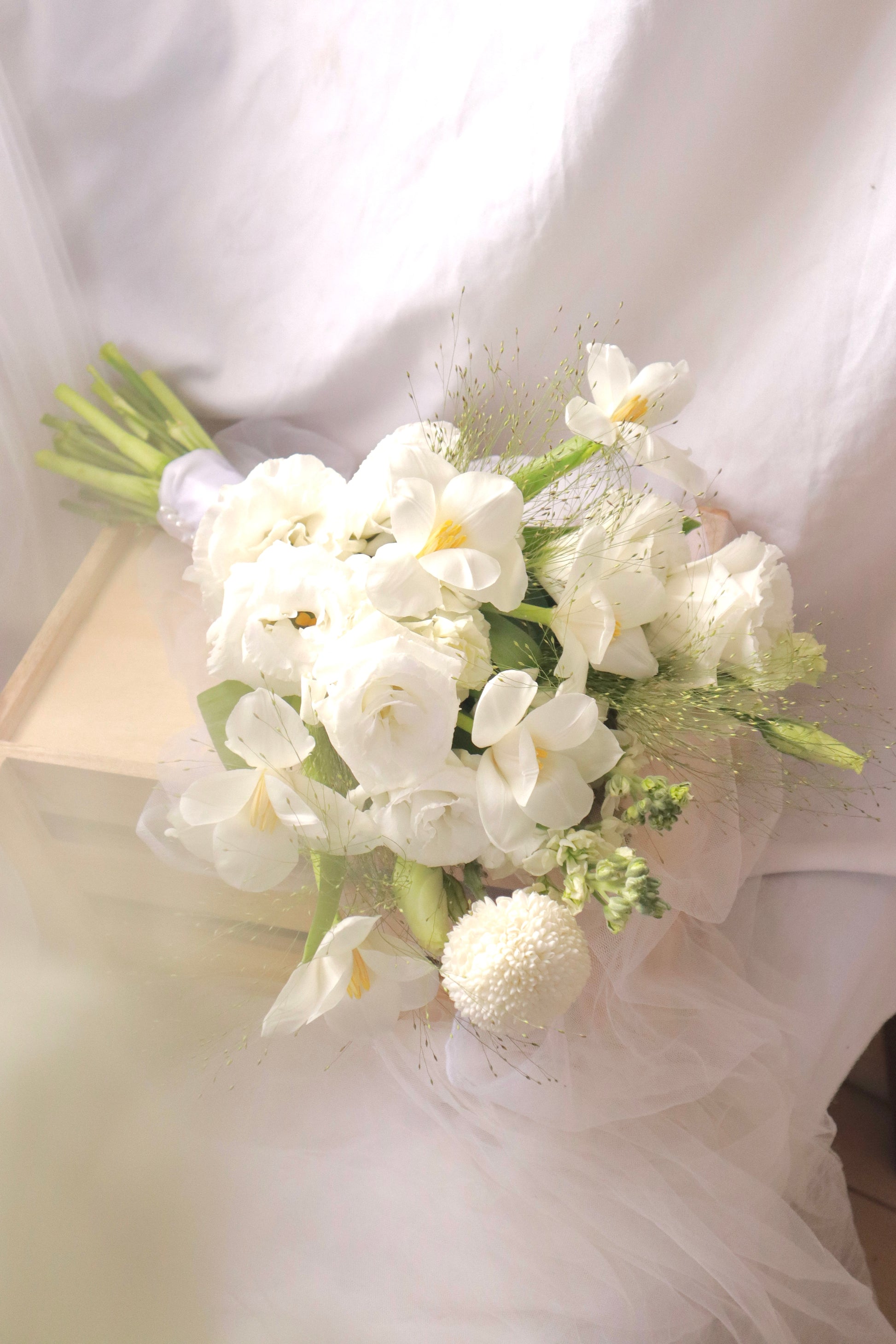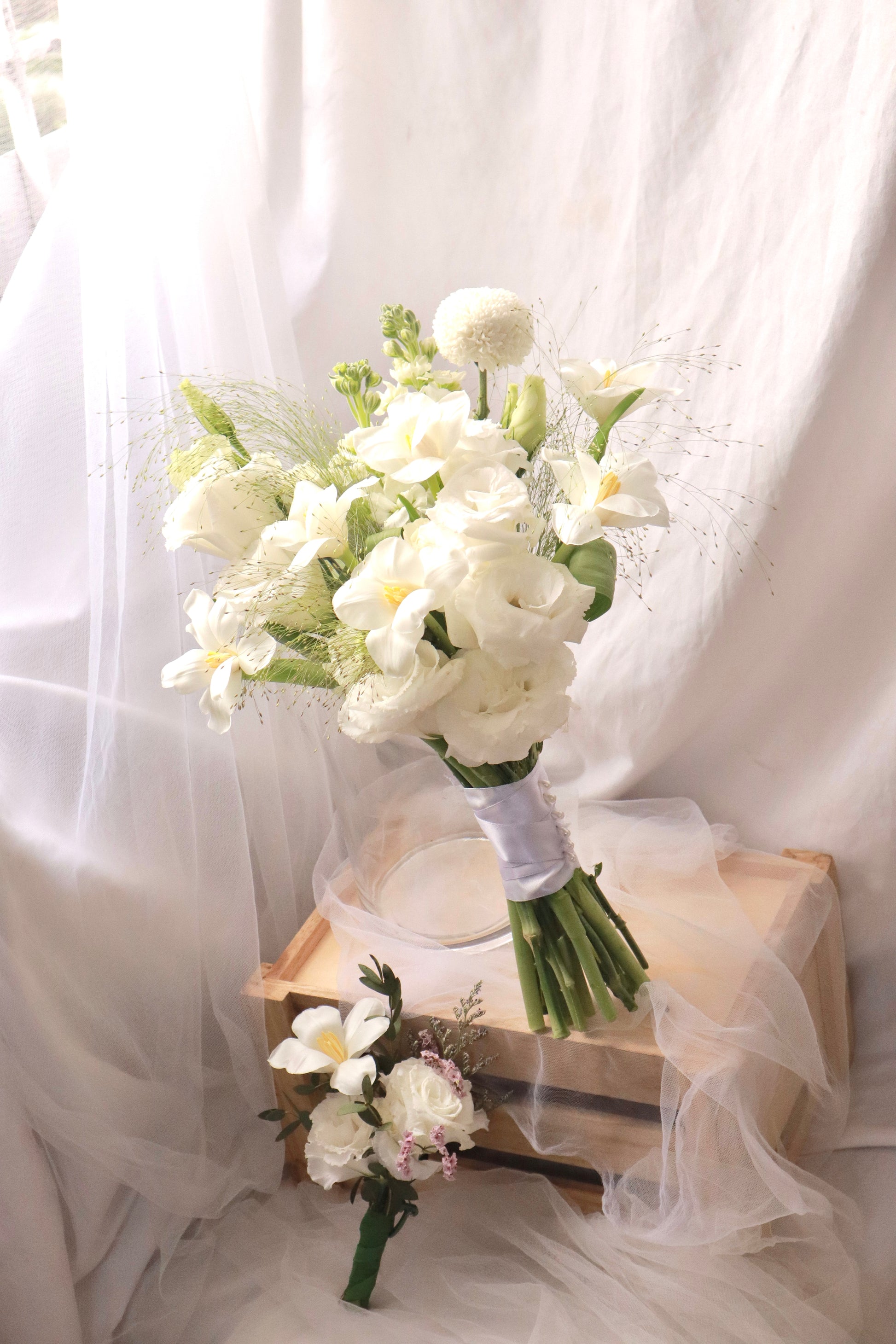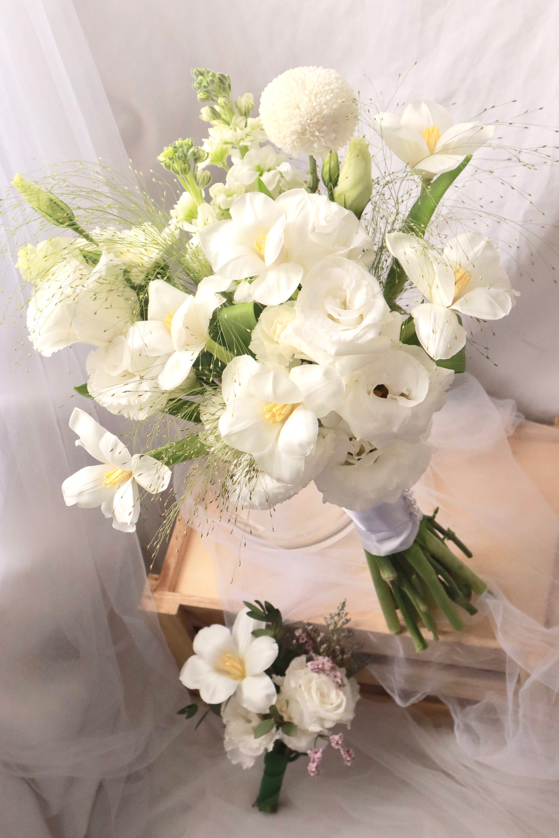 The Snowy White Wedding Bouquet features pristine white tulips, exuding pure elegance and timeless beauty. Perfect for any bride, this bouquet symbolizes grace and new beginnings, adding a touch of sophistication to your special day. Make your wedding unforgettable.