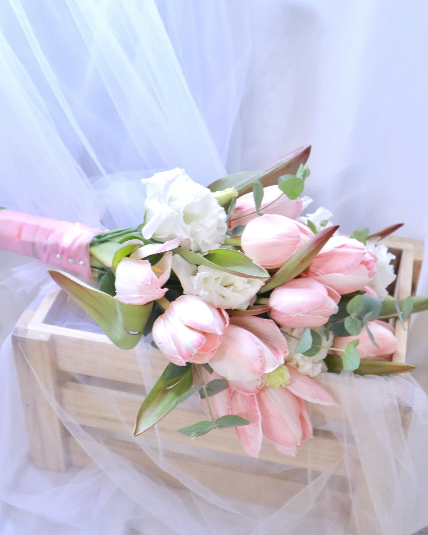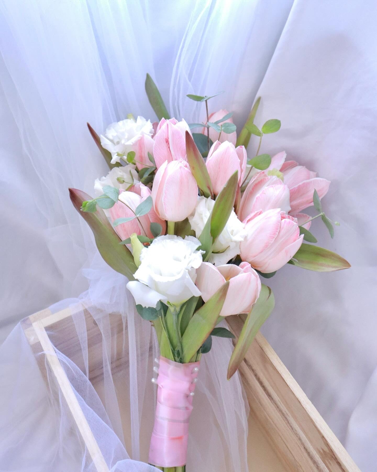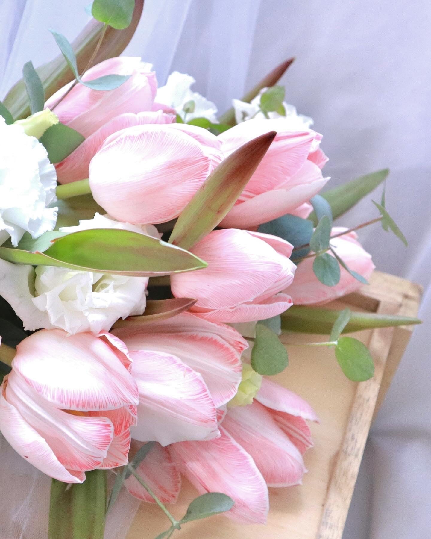Experience elegance with our Stunning Bridal Bloom bouquet, featuring tulips, white eustoma, and eucalyptus. Perfect for weddings, these fresh flowers create a breathtaking and romantic look, making your special day truly unforgettable and beautiful.