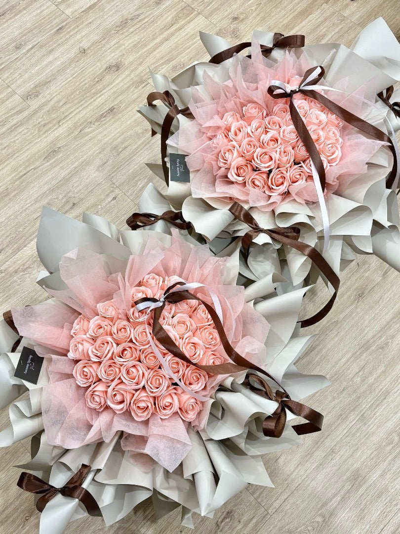 Timeless Devotion speaks of enduring love and deep admiration. The 33 coral pink soap flowers symbolize "I love you" in a lasting and heartfelt way, while the khaki wrapping adds a touch of earthy elegance and maturity. A perfect blend of passion and poise, this bouquet is ideal for meaningful occasions and lasting impressions.