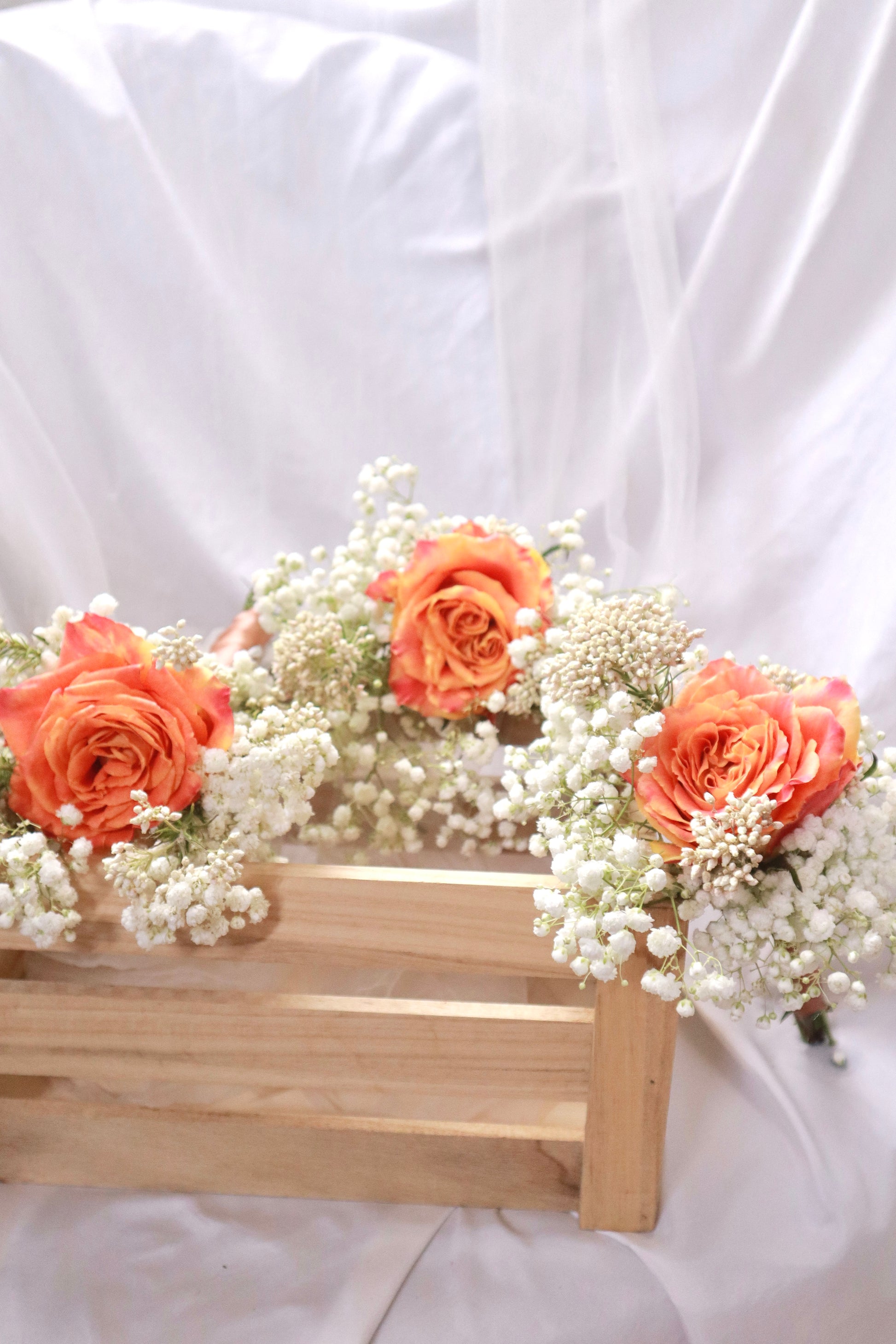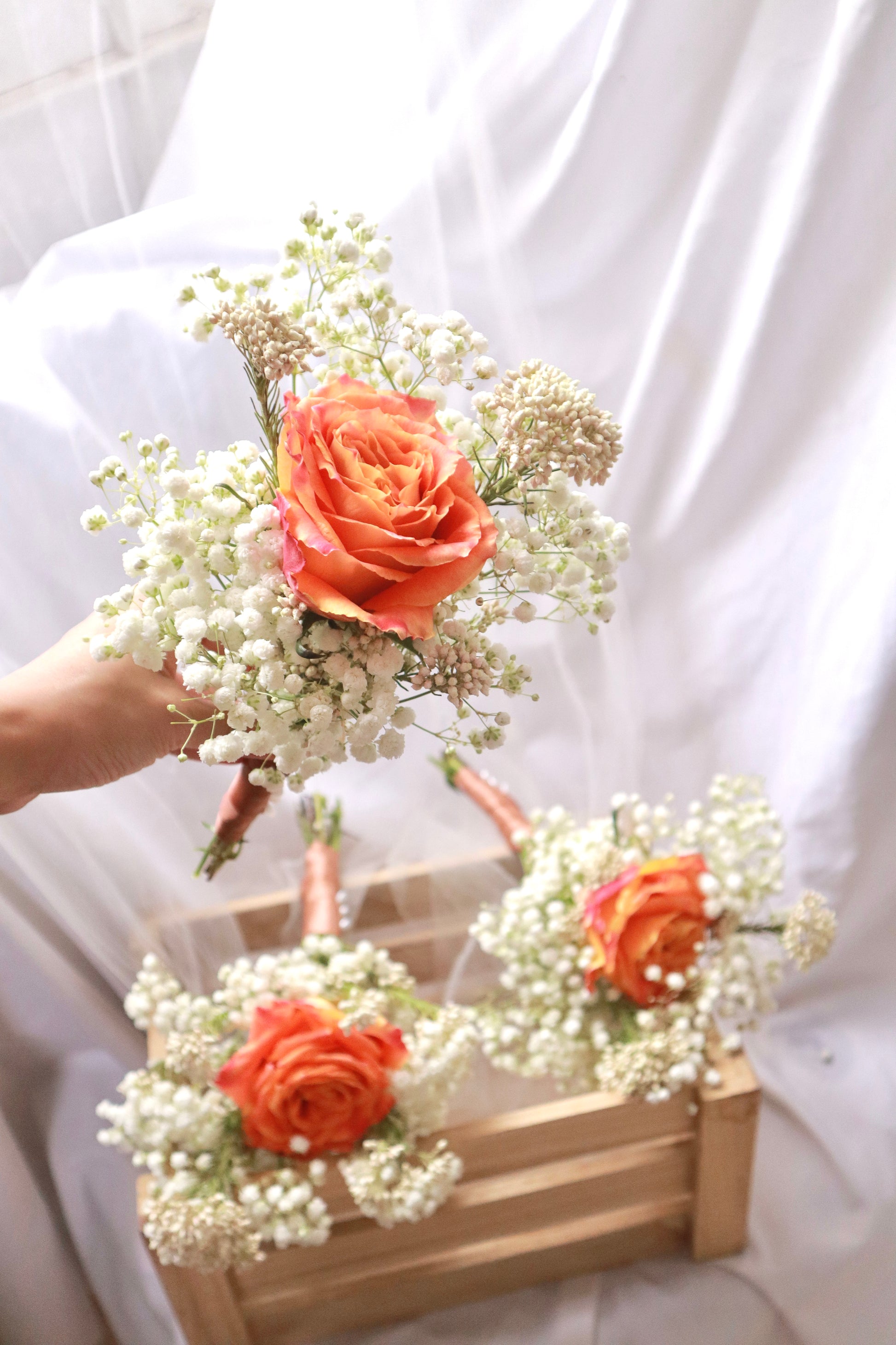 The Titian Bridesmaid Bouquet showcases a warm, vibrant palette with rich orange roses, delicate white rice flowers, and ethereal baby’s breath. This bouquet combines bold and soft elements, creating a striking and harmonious design perfect for any autumn celebration.
