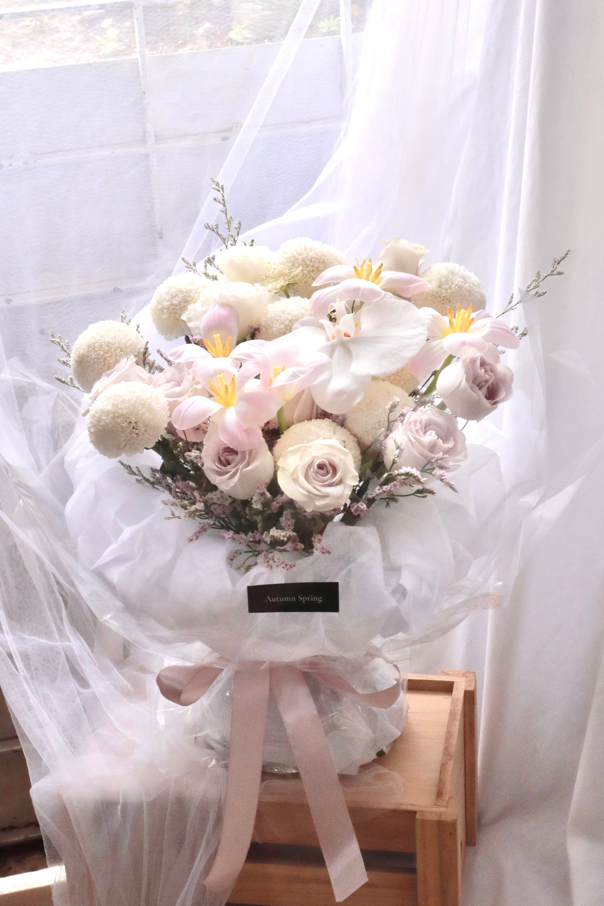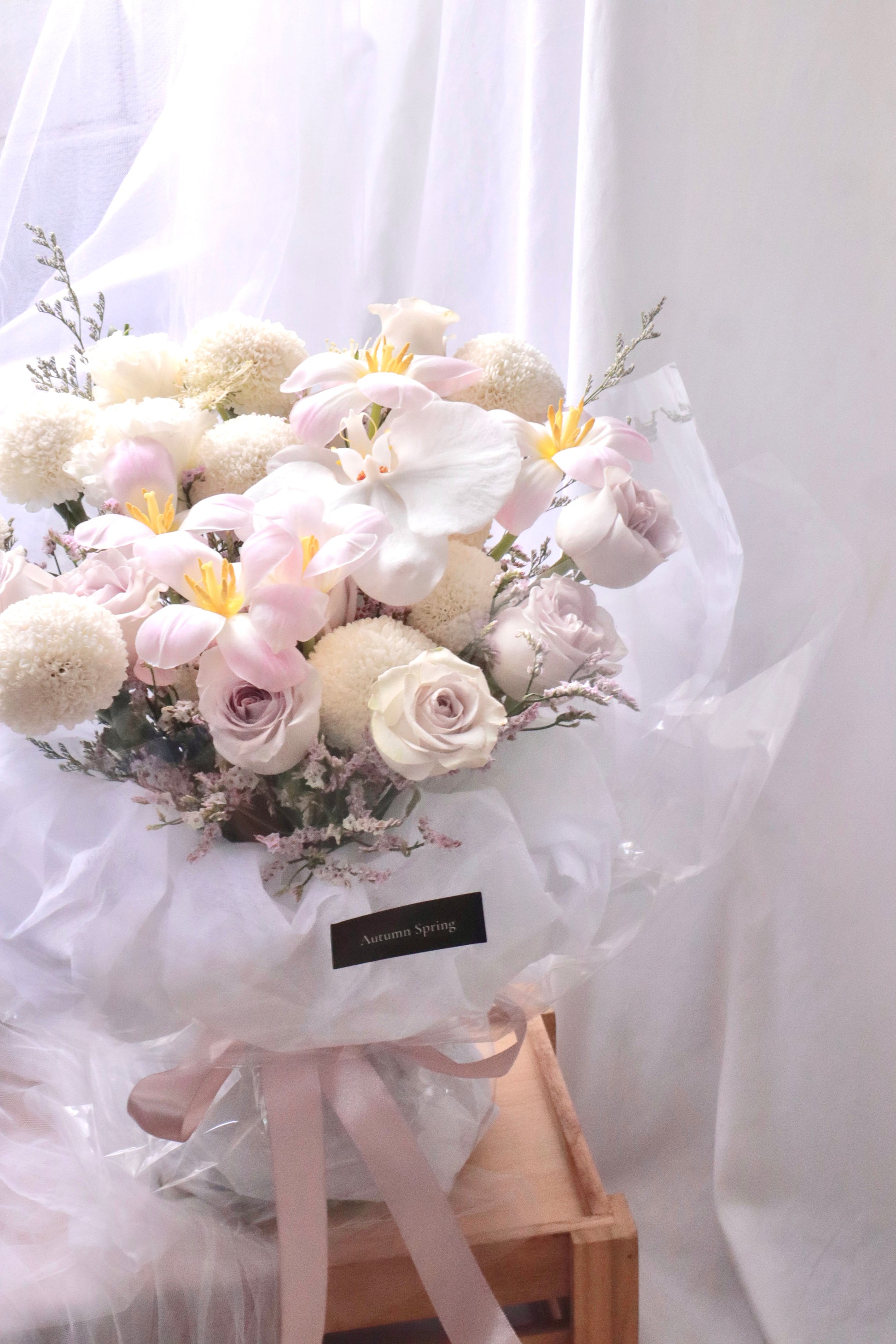 Experience serene elegance with the Tranquil Petal Mixed Flower Bouquet. Showcasing a harmonious blend of soft pinks, calming whites, and gentle purples, this bouquet radiates a peaceful charm, perfect for adding a touch of grace and tranquility to any occasion.