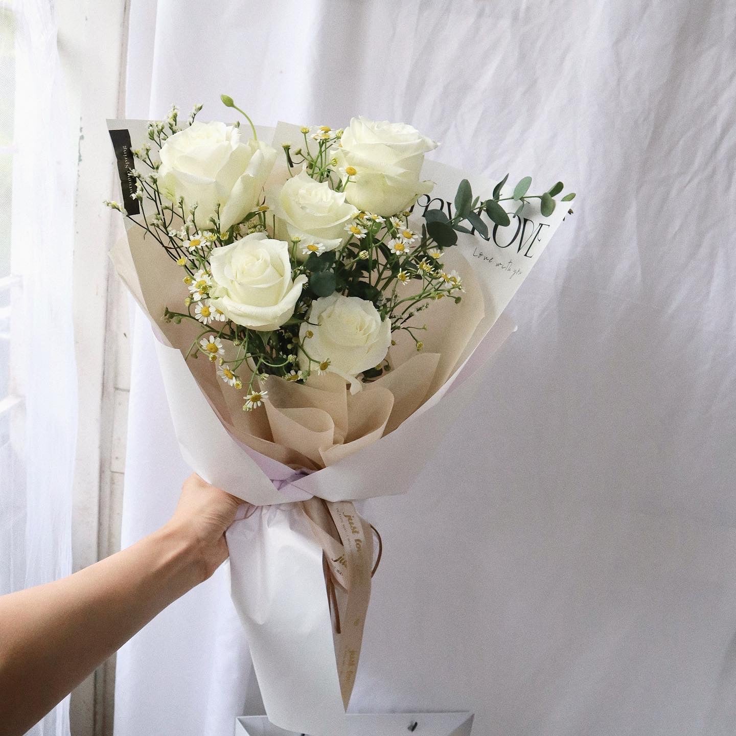 The Truly White Rose Bouquet showcases an elegant blend of pure whites and soft greenery, creating a fresh and timeless look. Its delicate, cloud-like petals paired with airy accents evoke a serene, natural beauty, perfect for adding a touch of grace to any setting.