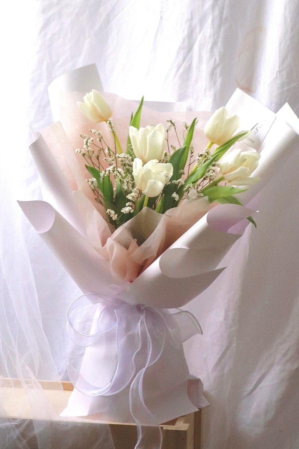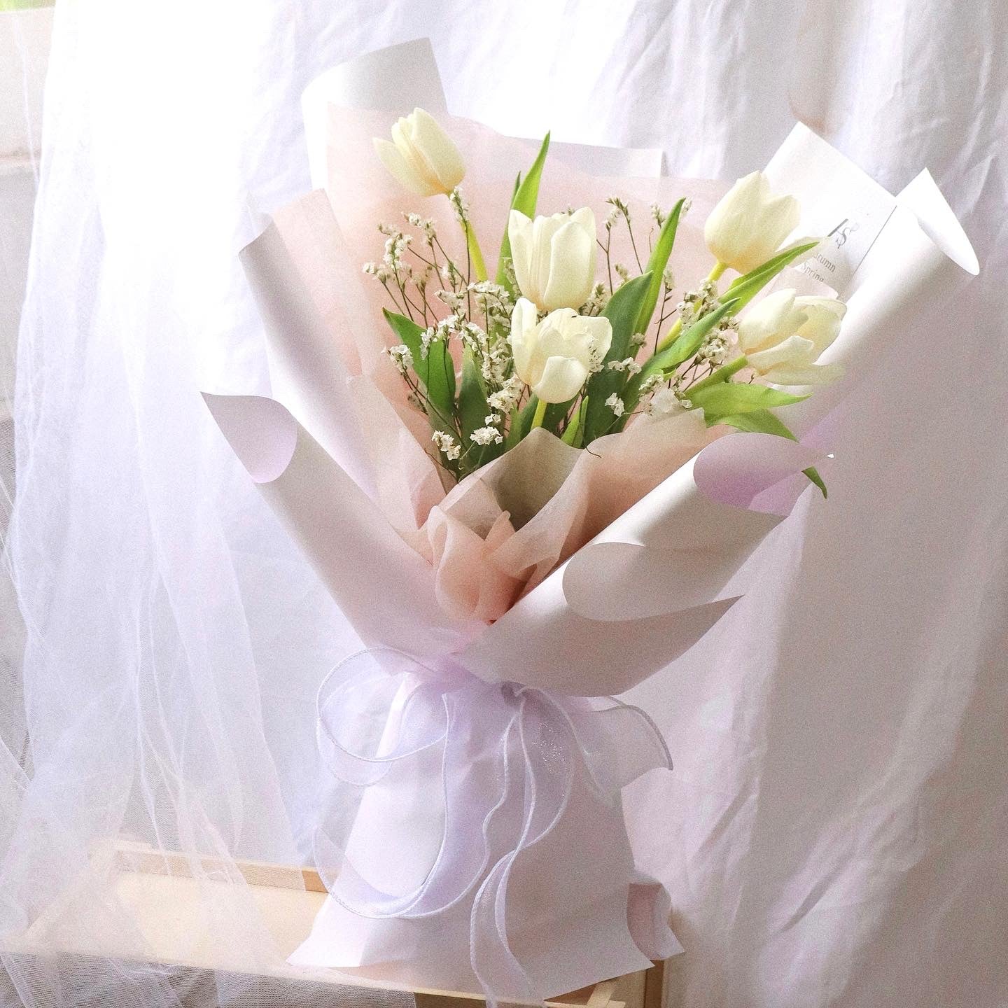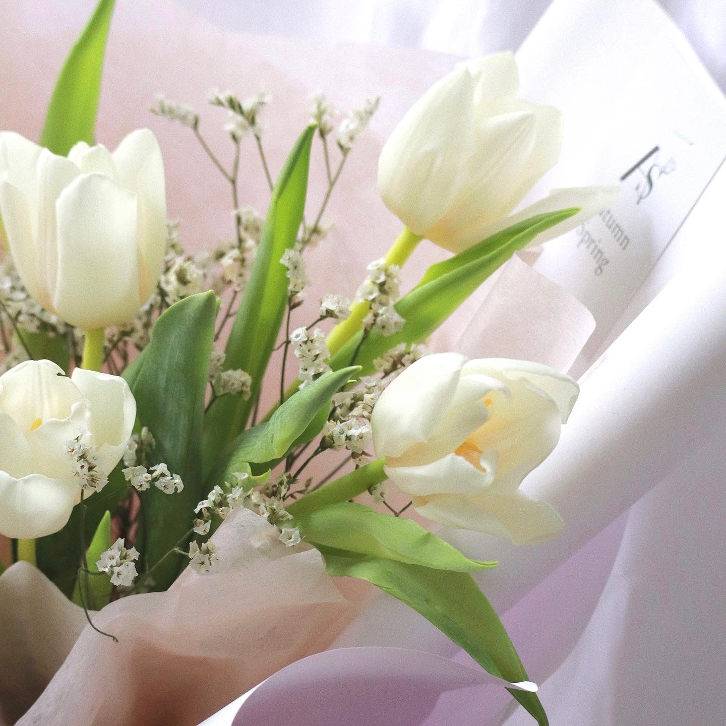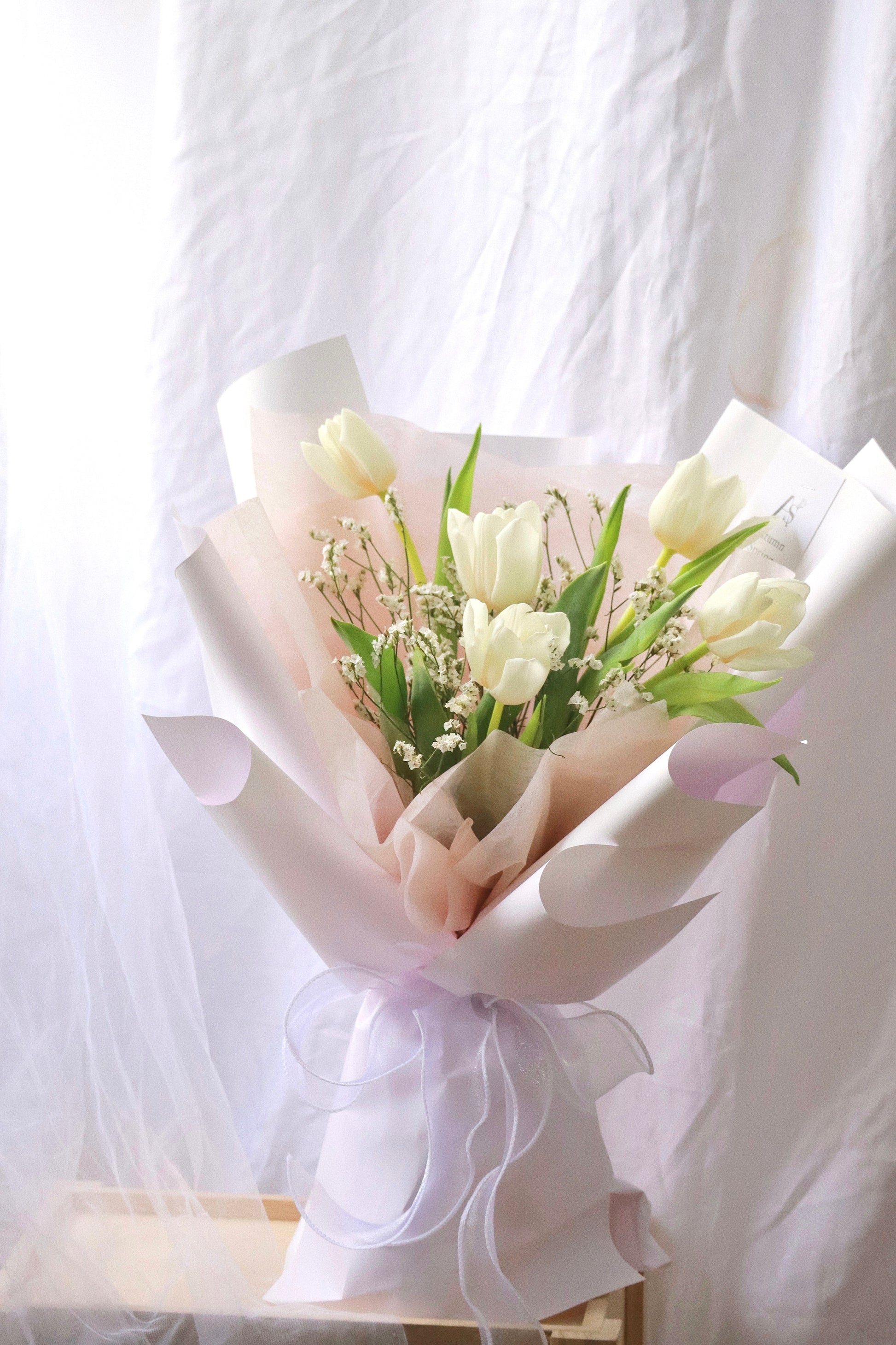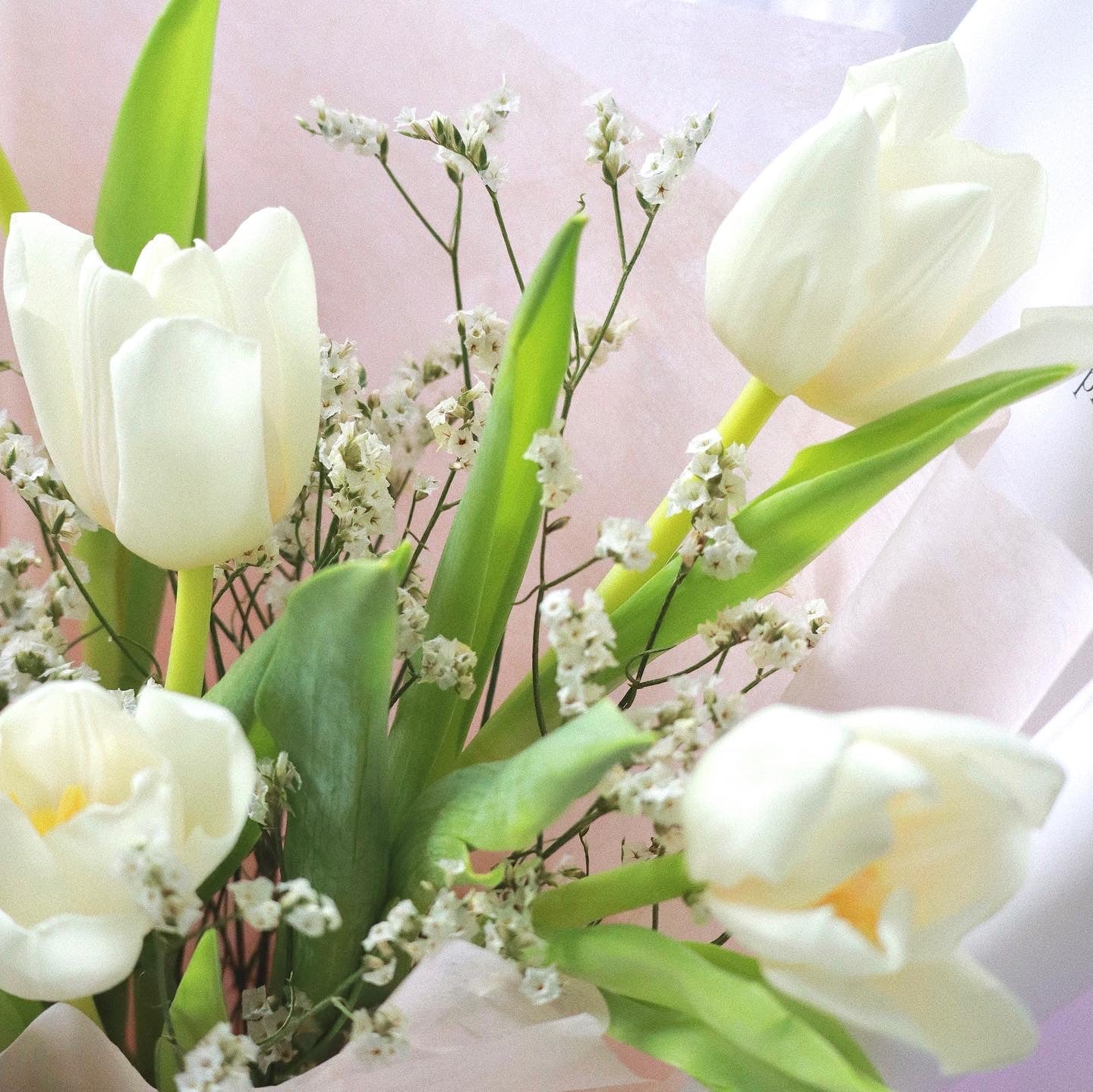 The Jade White Tulip Bouquet exudes a graceful balance of crisp whites and soft textures. With its airy petals and subtle accents, this arrangement evokes purity and calm, creating a refreshing and elegant display that beautifully complements any serene or classic space.ng.