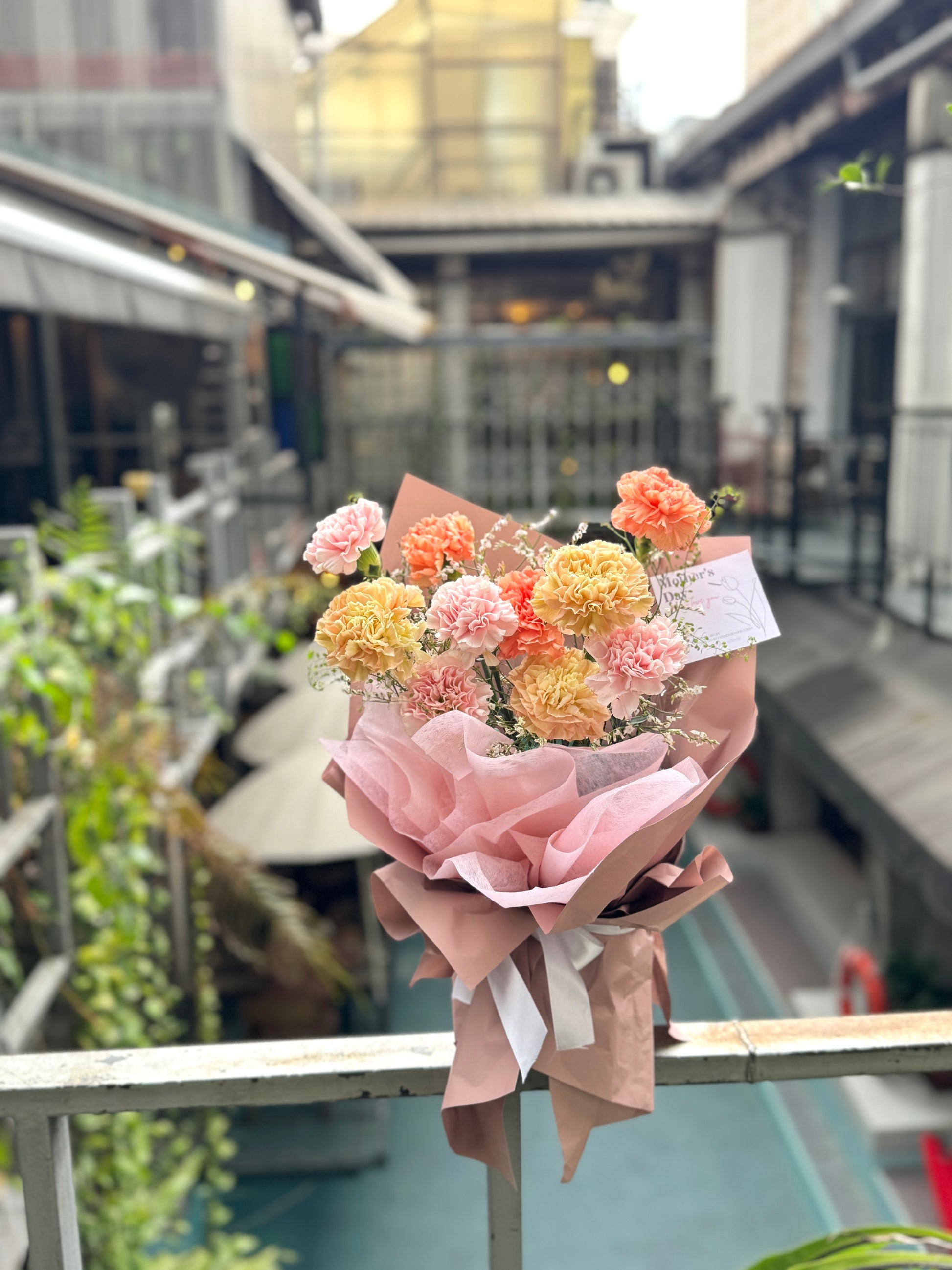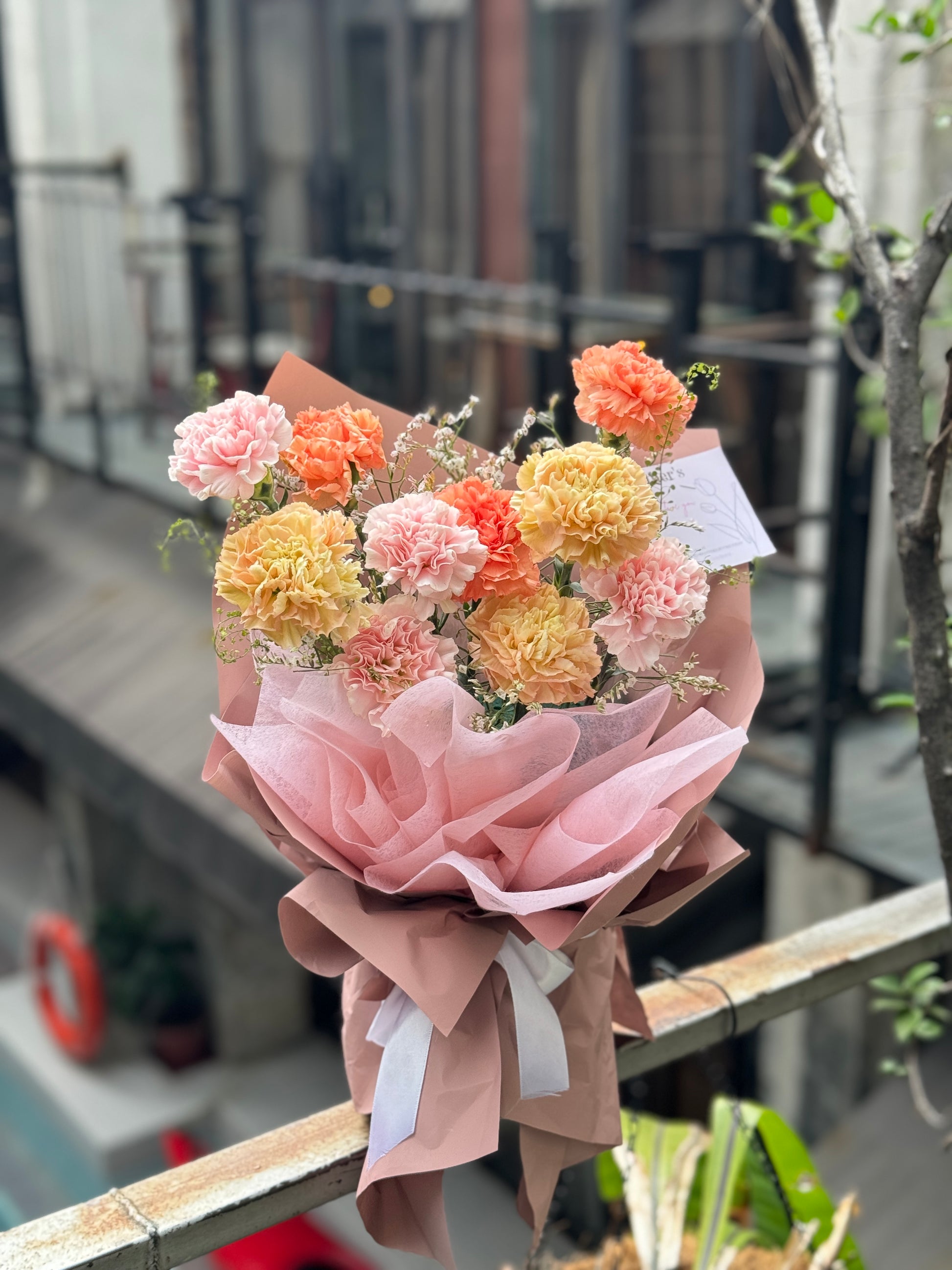Introducing the Vibrant Splendor Carnation Bouquet, featuring a lively mix of pink, orange, and peach carnations, accented with Thlaspi Green Bell. This bouquet radiates energy and charm, perfect for any celebration with its vibrant color palette and elegant arrangement.