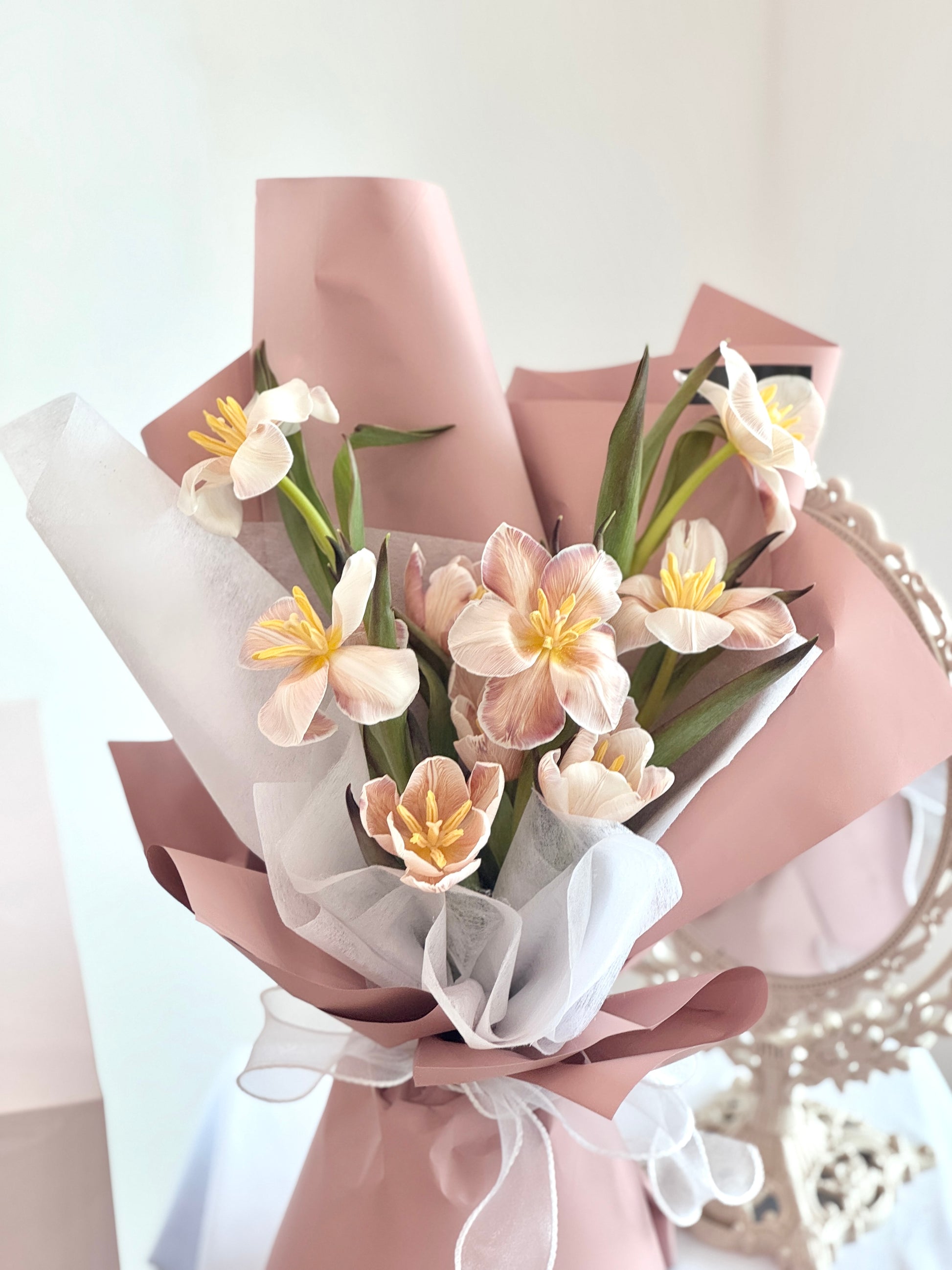 The Thirsty Dyed Brownie Tulip is a stunning fusion of earthy charm and artistic flair. With deep, rich hues of chocolate brown and subtle amber tones, these tulips have a warmth and depth that make them stand out. Their unique color, achieved through a delicate dyeing process, adds an intriguing twist to the timeless elegance of tulips. Perfect for those seeking something a little different, this bouquet brings sophistication, creativity, and a touch of the unexpected to any arrangement.