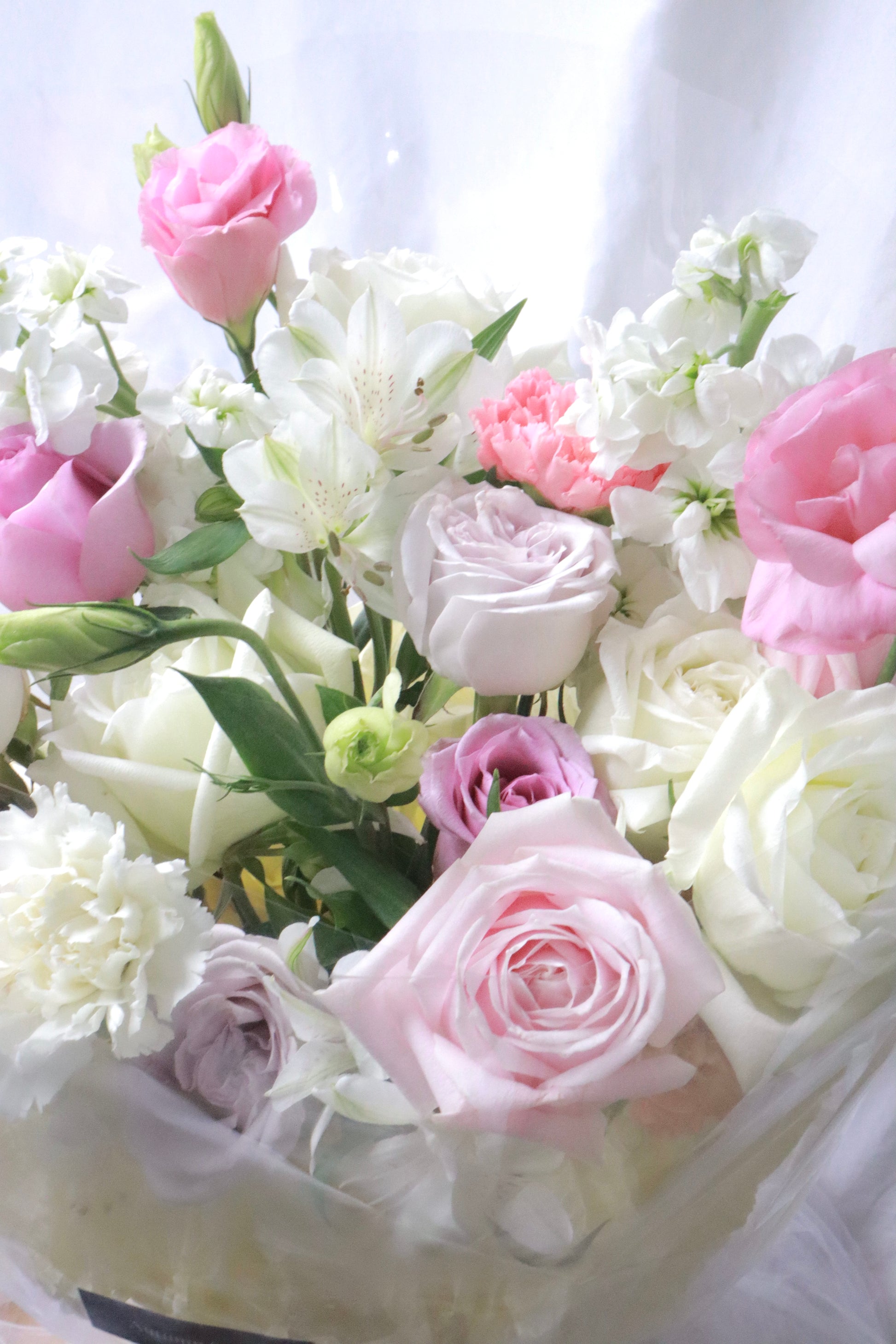 pink roses, white eustoma, pink fillers