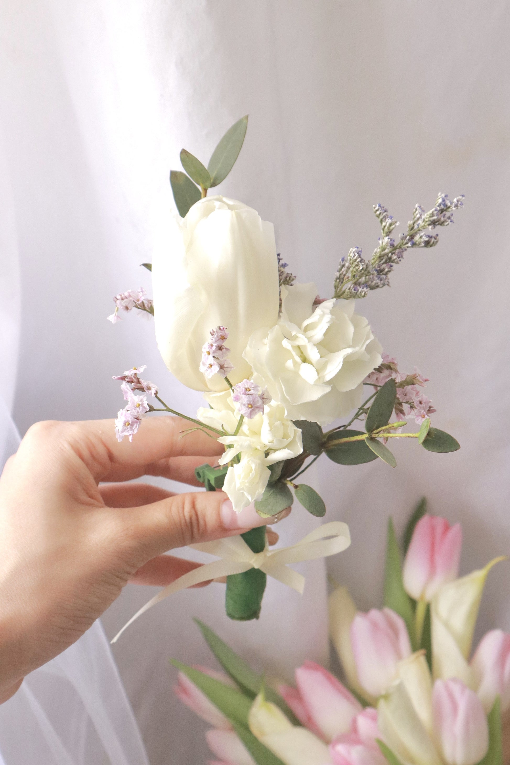 The Whispering Tulip Boutonniere exudes sophistication with its blend of white tulips, carnation spray, and delicate pink casphia. Perfect for weddings or formal events, this boutonniere adds a touch of elegance and charm to any ensemble.
