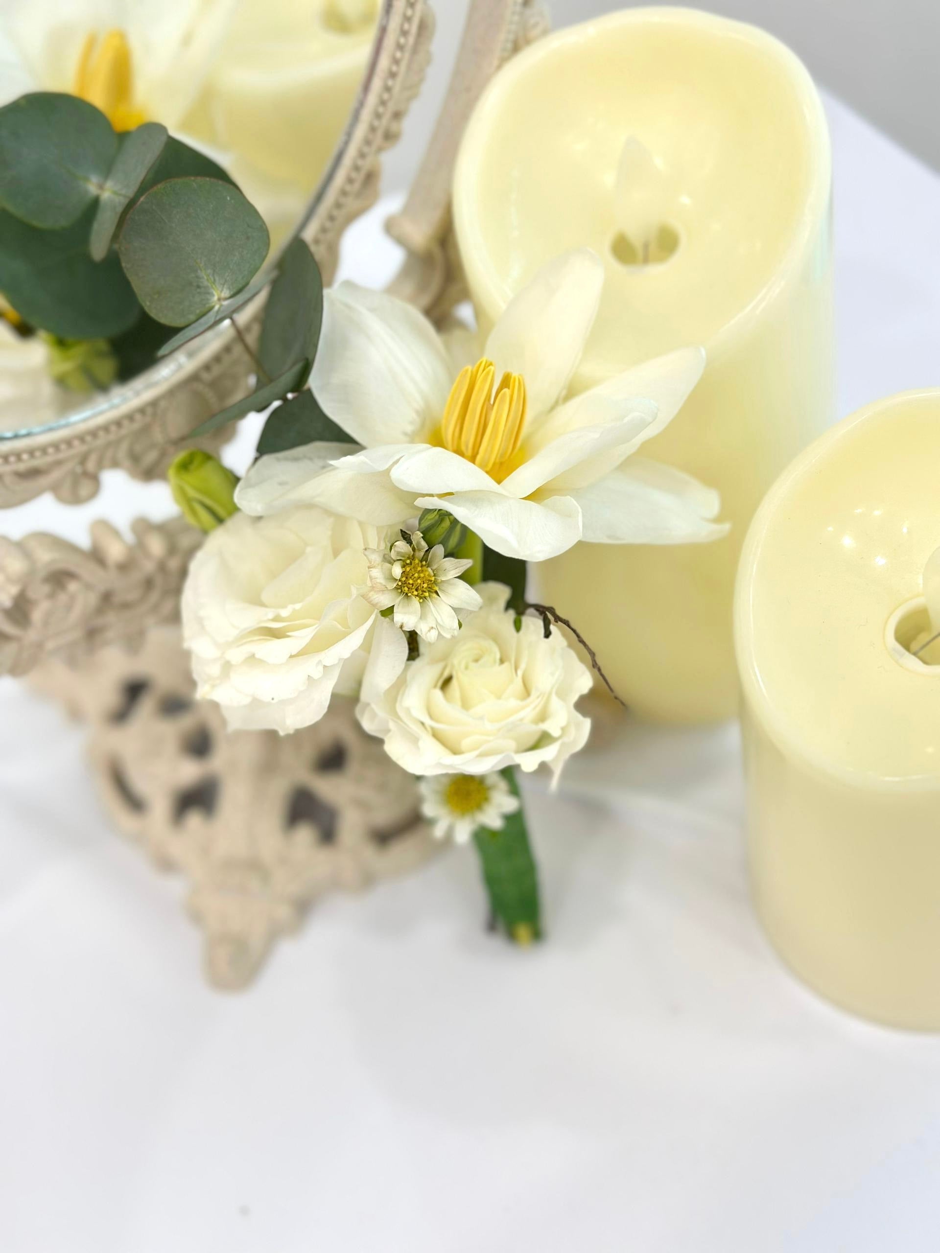 Elegance in simplicity, the White Tulip and White Eustoma Boutonniere embodies timeless beauty and grace. Ideal for the groom, groomsmen, or as a decorative touch to any formal ensemble, this boutonniere adds a touch of nature’s grace to your special day.