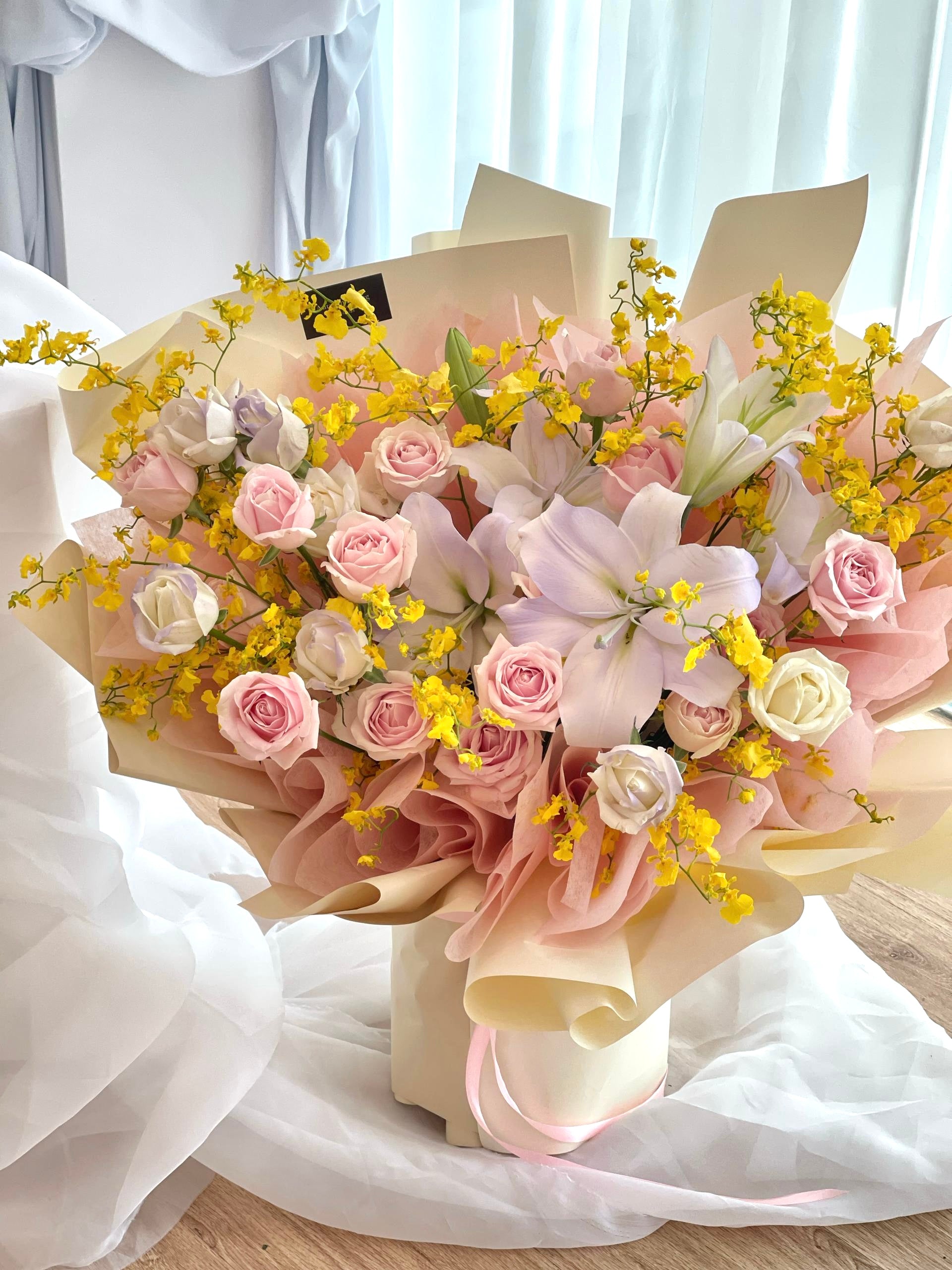 A radiant medley of golden blooms and soft pastels, the Sunlit Serenade captures the warmth of a sun-drenched morning. Bursting with cheerful yellows dancing lily, creamy whites lily flowers , and tender blush tones, this bouquet is a celebration of joy, hope, and harmony. Each stem is thoughtfully arranged to bring a gentle glow to any space—perfect for brightening someone's day or welcoming new beginnings.