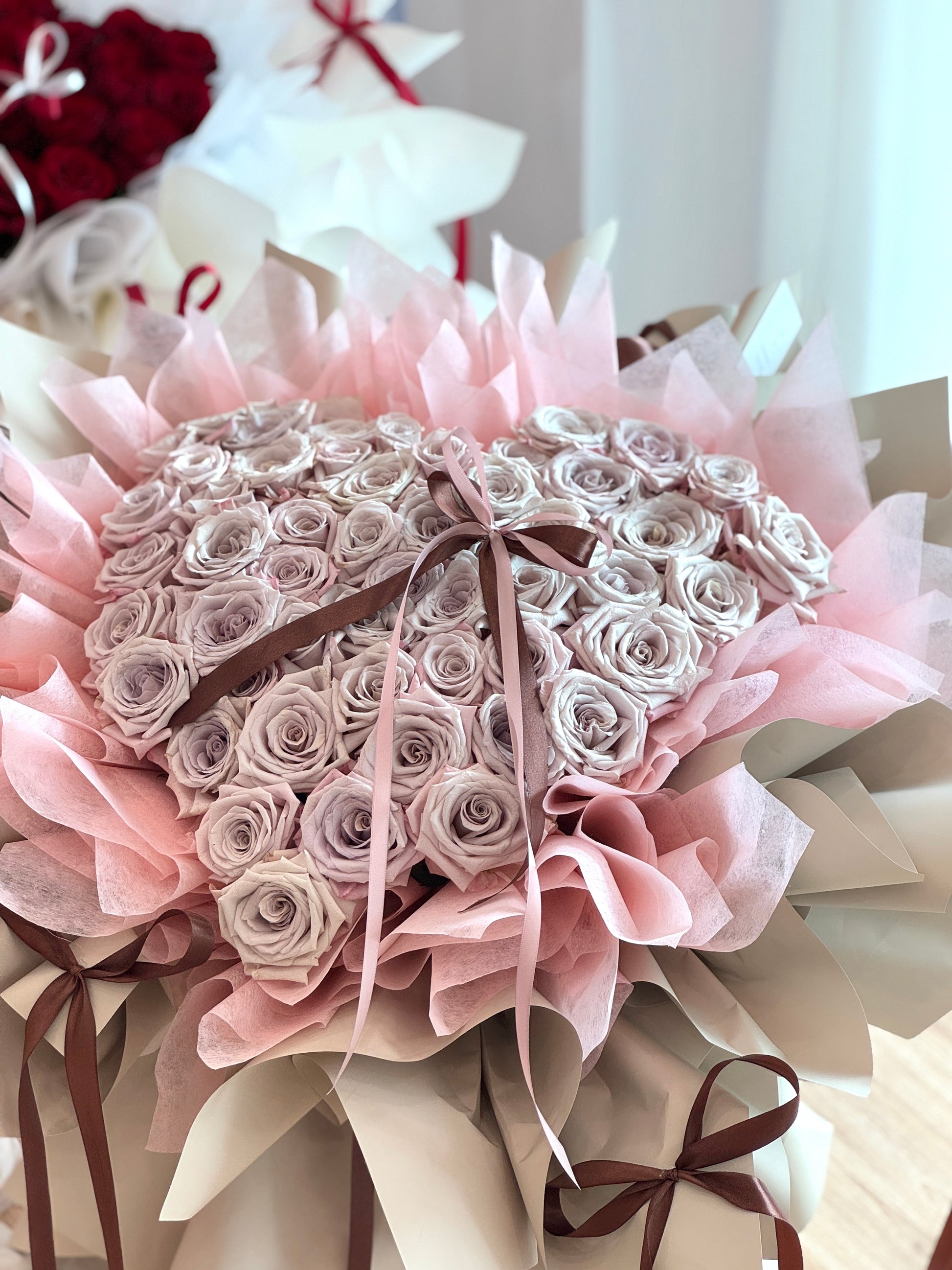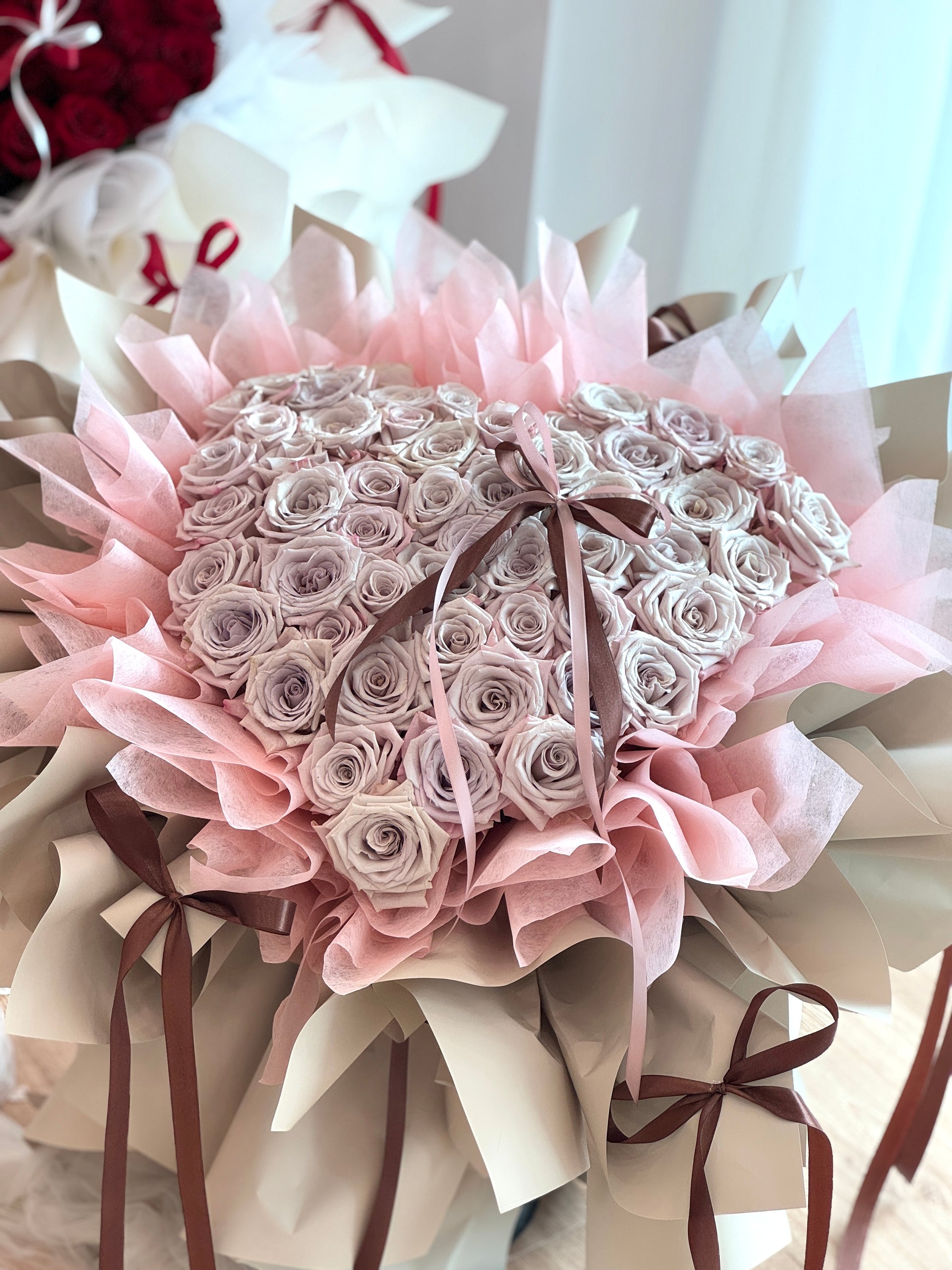 This elegant bouquet of 52 soft blush roses is a heartfelt declaration of eternal love — “I love you forever.” The roses are arranged in a delicate heart shape, wrapped in layers of pastel pink and beige paper, and adorned with brown satin ribbons. It’s the perfect expression for anniversaries, proposals, or any moment meant to last a lifetime.